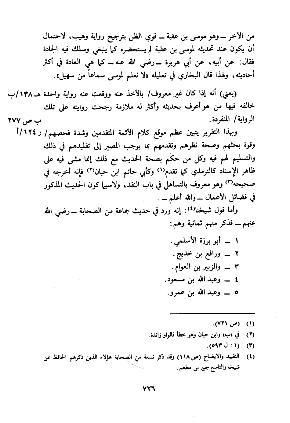 4 التقييد والإيضاح ص118 وقد ذكر تسعة من الصحابة هؤلاء الذين ذكرهم الحافظ عن شيخه والتاسع جبير بن مطعم.