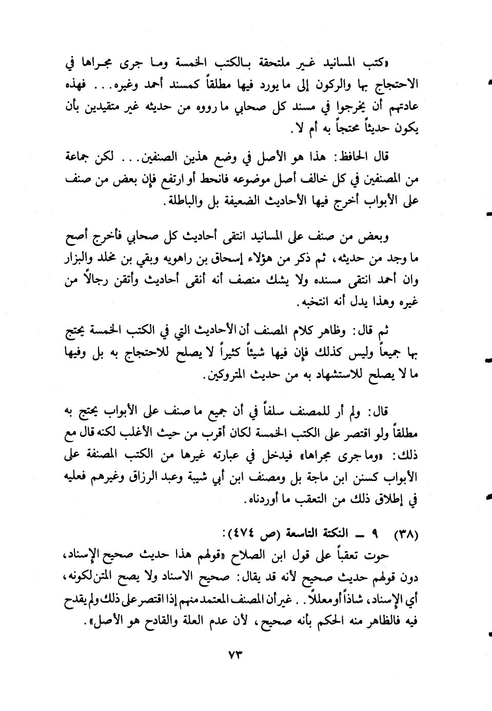 ثم قال: "فظاهر كلام المصنف أن الأحاديث التي في كتب الخمسة يحتج بها جميعا وليس كذلك؛ فإن فيها شيئا كثيرا لا يصلح للاحتجاج به، بل وفيها ما لا يصلح للاستشهاد به من حديث المتروكين) قال: "ولم أر للمصنف سلفا في أن جميع ما صنف على الأبواب يحتج به مطلقا ولو اقتصر على الكتب الخمسة لكان أقرب من حيث الأغلب لكنه قال مع ذلك: "وما جرى مجراها) فيدخل في عبارته غيرها من الكتب المصنفة على الأبواب كسنن ابن ماجه بل ومصنف ابن أبي شيبة وعبد الرزاق وغيرهم فعليه في إطلاق ذلك من التعقب ما أوردناه".