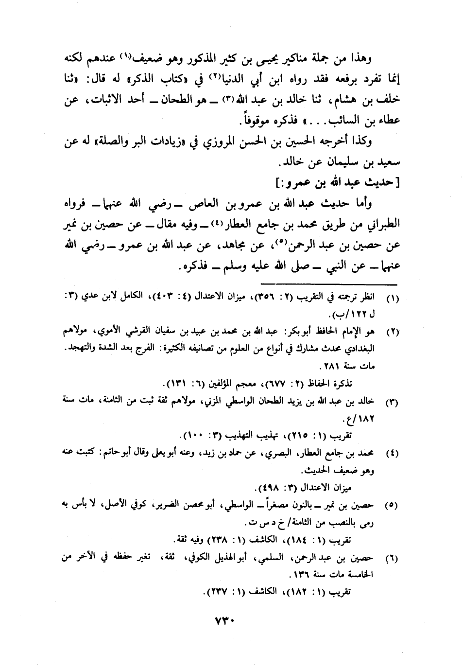 وأما حديث عبد الله بن عمرو بن العاص - رضي الله عنه - فرواه الطبراني من طريق محمد بن جامع العطار4 - وفيه مقال- عن حصين بن نمير5 عن حصين بن عبد الرحمن 6، عن مجاهد، عن عبد الله بن عمرو - رضي الله عنهما - عن النبي - صلى الله عليه وسلم - فذكره.