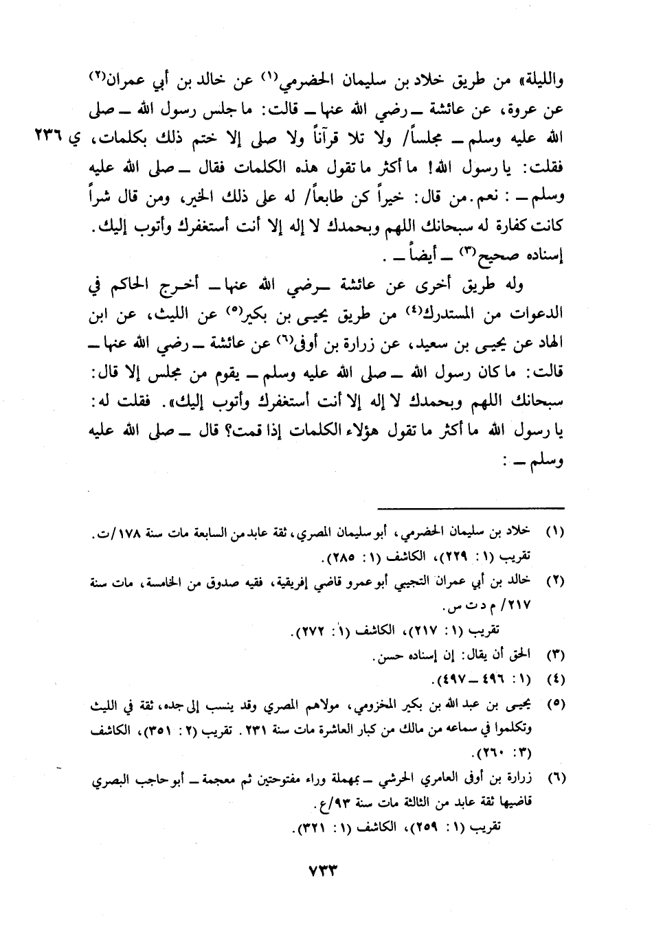 والليلة" من طريق خلاد بن سليمان الحضرمي1 عن خالد بن أبي عمران2 عن عروة، عن عائشة - رضي الله عنها - قالت: "ما جلس رسول الله - صلى الله عليه وسلم - مجلسا/ (ي236) ولا تلا قرآنا ولا صلى إلا ختم ذلك بكلمات، فقلت: يا رسول الله! ما أكثر ما تقول هذه الكلمات فقال - صلى الله عليه وسلم -: "نعم من قال: خيرا كن طابعا له على ذلك الخير، ومن قال شرا كانت كفارة له سبحانك الله وبحمدك لا إله إلا أنت أستغفرك وأتوب إليك". إسناده صحيح3 - أيضا -.
