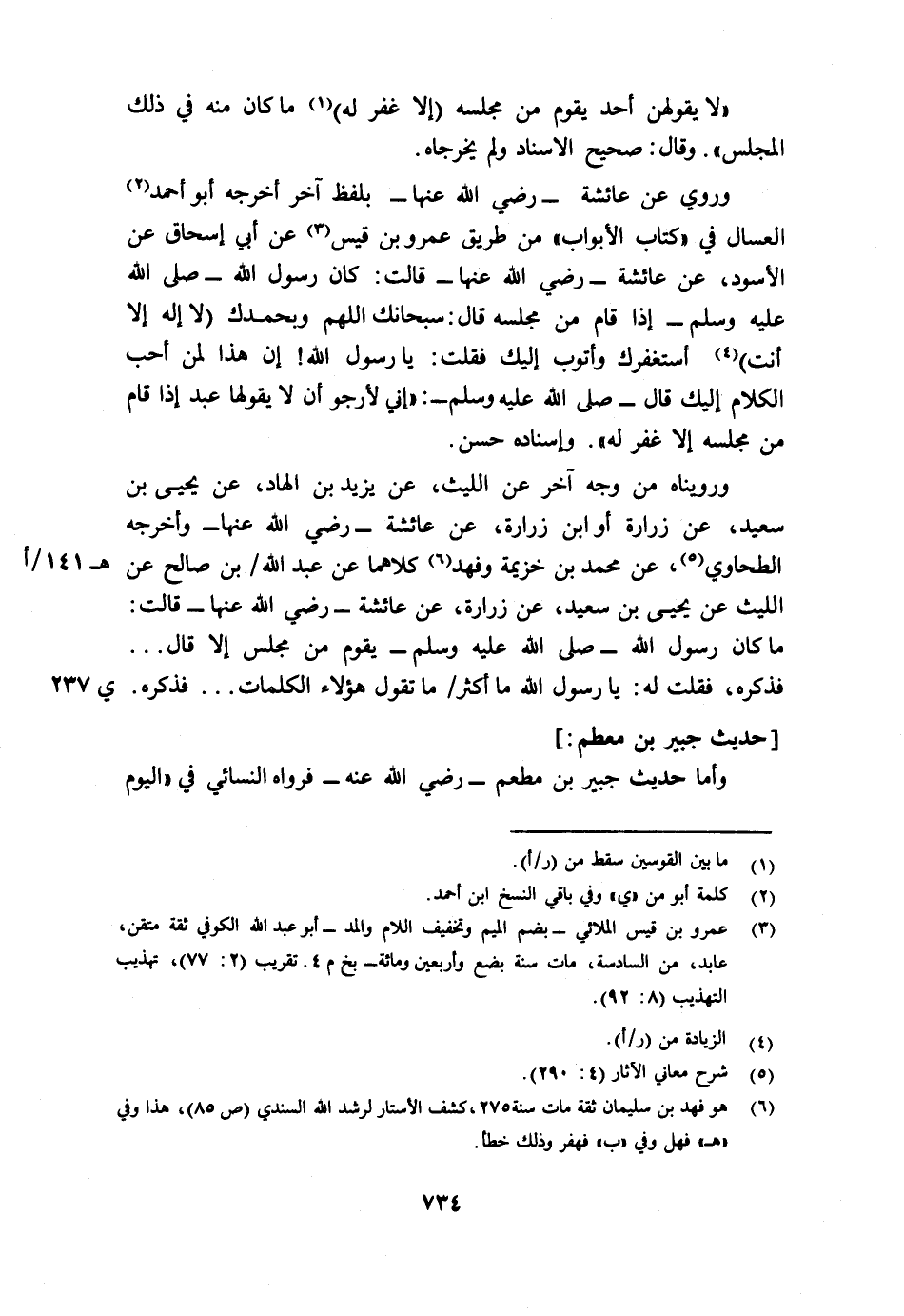 وروينا من وجه آخر عن الليث، عن يزيد بن الهاد، عن يحيى بن سعيد، عن زرارة أو ابن زرارة، عن عائشة - رضي الله عنها - وأخرجه الطحاوي5، عن محمد بن خزيمة وفهد6 كلاهما عن عبد الله/ (141/أ) بن صالح عن الليث عن يحيى بن سعيد، عن زرارة، عن عائشة - رضي الله عنها - قالت: "ما كان رسول الله - صلى الله عليه وسلم - يقوم من مجلس إلا قال ... فذكره، فقلت له: يا رسول الله ما أكثر/ (ي 237) ما تقول هؤلاء الكلمات ... " فذكره.