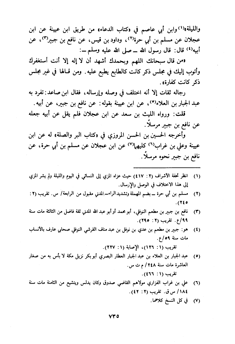 1 انظر تحفة الأشراف 2/417 حيث عزاه المزي إلى النسائي في اليوم والليلة ولم يشر المزي إلى هذا الاختلاف في الوصل والإرسال.