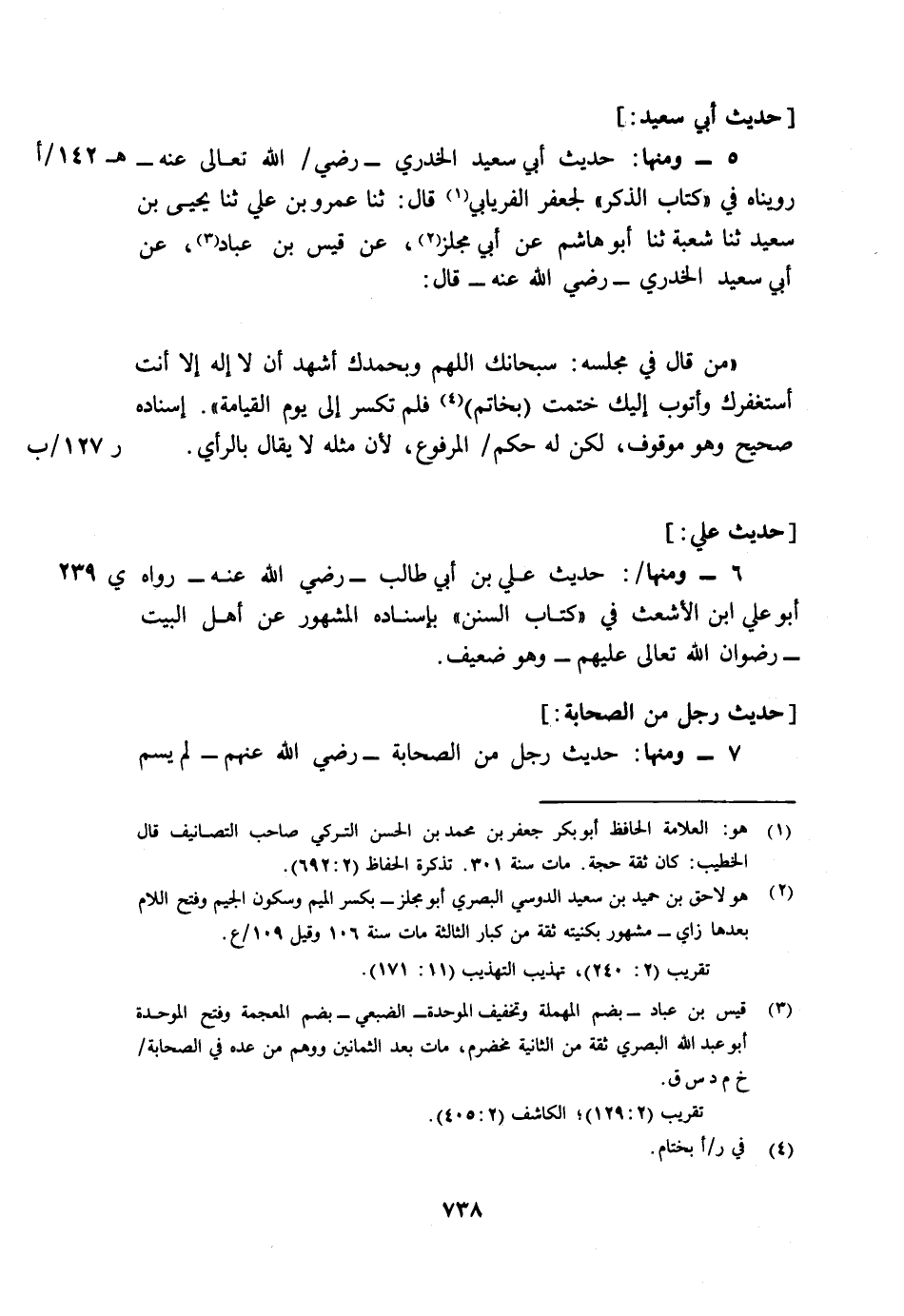 5- ومنها: حديث أبي سعيد الخدري - رضي/ (142/أ) الله تعالى عنه - رويناه في "كتاب الذكر" لجعفر الفريابي1 قال: ثنا عمرو بن علي ثنا يحيى بن سعيد ثنا شعبة ثنا أبو هاشم عن أبي مجلز2، عن قيس بن عباد 3، عن أبي سعيد الخدري - رضي الله عنه -قال: " من قال في مجلسه: سبحانك اللهم وبحمدك أشهد أن لا إله إلا أنت أستغفرك وأتوب إليك ختمت (بخاتم) 4 فلم تكسر إلى يوم القيامة". إسناده صحيح وهو موقوف، لكن له حكم ر127/ب المرفوع، لأن مثله لا يقال بالرأي.