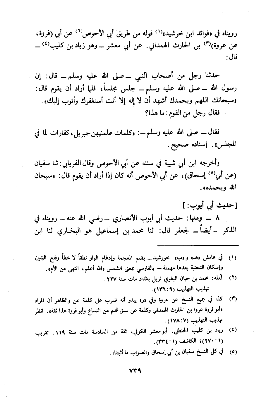 وأخرجه ابن أبي شيبة في سننه عن أبي الأحوص وقال الفريابي: ثنا سفيان (عن أب 5 إسحاق) ، عن أبي الأحوص أنه كان إذا أراد أن يقوم قال: "سبحان الله وبحمده".