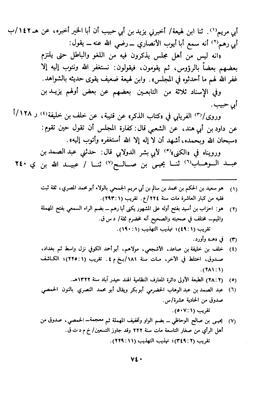وروى/ (ر128/أ) 3 الفريابي في "كتاب الذكر" عن قتيبة، عن خلف بن خليفة4 عن داود بن أبي هند، عن الشعبي قال: كفارة المجلس أن تقول حين تقوم: "سبحان الله وبحمده، أشهد أن لا إله الله أستغفره وأتوب إليه".