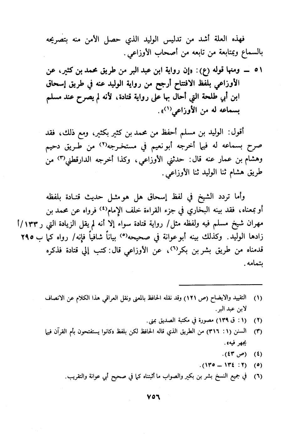 51- ومنها قوله (ع) : "إن رواية ابن عبد البر من طريق محمد بن كثير، عن الأوزاعي بلفظ الافتتاح أرجح من رواية الوليد عنه في طريق إسحاق ابن أبي طلحة التي أحال بها على رواية قتادة، لأنه لم يصرح عند مسلم بسماعه من الأوزاعي"1.