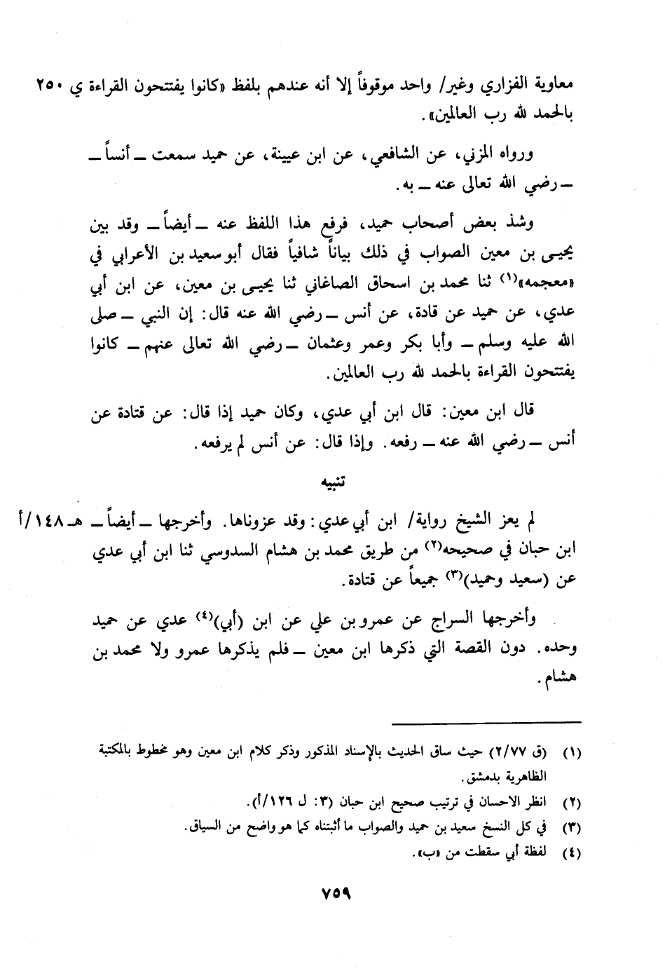 وأخرجهما السراج عن عمرو بن علي عن ابن (أبي) 4 عدي عن حميد وحده. دون القصة التي ذكرها ابن معين - فلم يذكرها عمرو ولا محمد بن هشام.