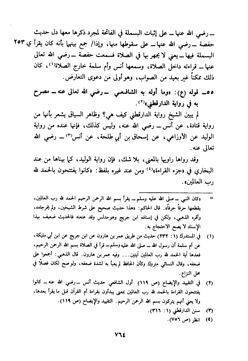 2 في التقييد والإيضاح ص 119 أول الشافعي حديث أنس - رضي الله عنه - كانوا يفتتحون القراءة بالحمد لله رب العالمين بمعنى يبدؤون بقراءة أم القرآن قبل ما يقرأ بعدها، ولا يعني أنهم يتركون بسم الله الرحمن الرحيم. التقييد والإيضاح ص119.
