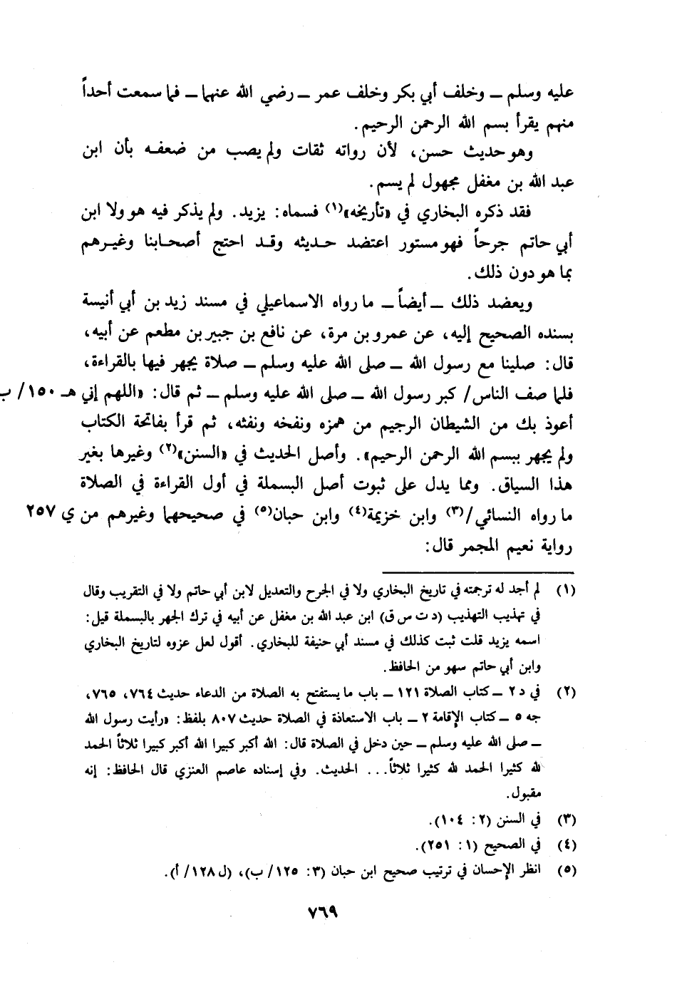 ويعضد ذلك - أيضا - ما رواه الإسماعيلي في مسند زيد بن أبي أنيسة بسنده الصحيح إليه، عن عمرو بن مرة، عن نافع بن جبير بن مطعم عن أبيه، قال: صلينا مع رسول الله - صلى الله عليه وسلم - صلاة يجهر فيها بالقراءة، فلما صف الناس/ (?150/ب) كبر رسول الله - صلى الله عليه وسلم - ثم قال: "اللهم إني أعوذ بك من الشيطان الرجيم من همزة ونفخه ونفثه، ثم قرأ بفاتحة الكتاب ولم يجهر ببسم الله الرحمن الرحيم". وأصل الحديث في "السنن"2 وغيرها بغير هذا السياق. ومما يدل على ثبوت أصل البسملة في أول القراءة في الصلاة ما رواه النسائي/ (ي 257) 3 وابن خزيمة4 وابن حبان5 في صحيحيهما وغيرهم من رواية نعيم المجمر قال: