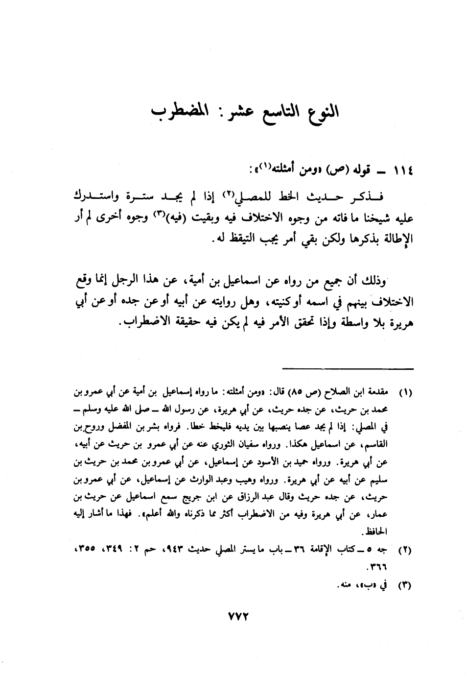 1 مقدمة ابن الصلاح ص85 قال: "ومن أمثلته: ما رواه إسماعيل بن أمية عن أبي عمرو بن محمد بن حريث، عن جده حريث، عن أبي هريرة، عن رسول الله - صلى الله عليه وسلم - في المصلى: إذا لم يجد عصا ينصبها بين يديه فليخط خطا. فرواه بشر بن المفضل وروح بن القاسم، عن إسماعيل هكذا. ورواه سفيان الثوري عنه عن أبي عمرو بن حريث عن أبيه عن أبي هريرة، ورواه حميد بن الأسود عن إسماعيل عن أبي عمرو محمد بن حريث بن سليم عن أبيه عن أبي هريرة، ورواه وهيب وعبد الوارث عن إسماعيل عن أبي عمرو بن حريث عن جده حريث، وقال عبد الرزاق عن ابن جريج سمع إسماعيل عن حريث بن عمار، عن أبي هريرة وفيه من الاضطراب أكثر مما ذكرناه والله أعلم" فهذا ما أشار إليه الحافظ.