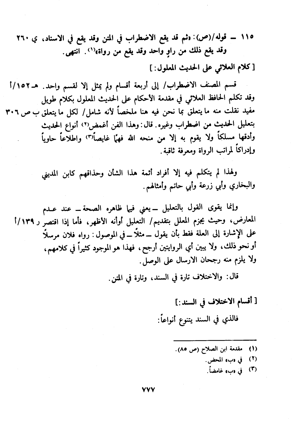 وقد تكلم الحافظ العلائي في مقدمة الأحكام على الحديث المعلول بكلام طويل مفيد نقلت منه ما يتعلق بما نحن فيه هنا ملخصا لأنه شامل (ب ص 306) لكل ما يتعلق بتعليل الحديث من اضطراب وغيره. قال: وهذا الفن أغمض2 أنواع الحديث وأدقها مسلكا ولا يقوم به إلا من منحه الله فهما غايصا3 واطلاعا حاويا وإدراكا لمراتب الرواة ومعرفة ثاقبة.
