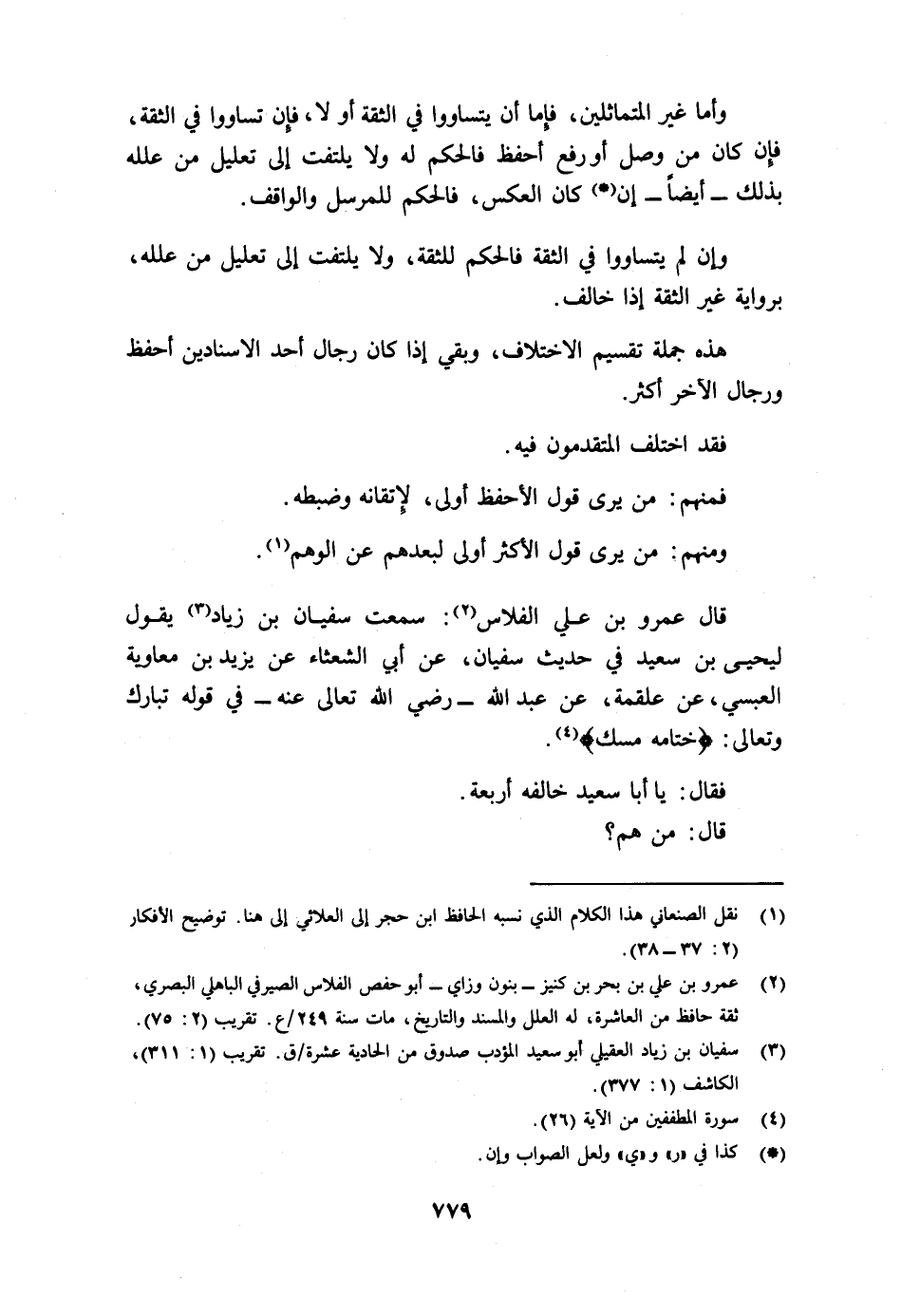 وأما غير المتماثلين، فإما أن يتساووا في الثقة أو لا، فإن تساووا في الثقة فإن كان من وصل أو رفع أحفظ فالحكم له، ولا يلتفت إلى تعليل من علله بذلك - أيضا- إن 1 كان العكس، فالحكم للمرسل والواقف.