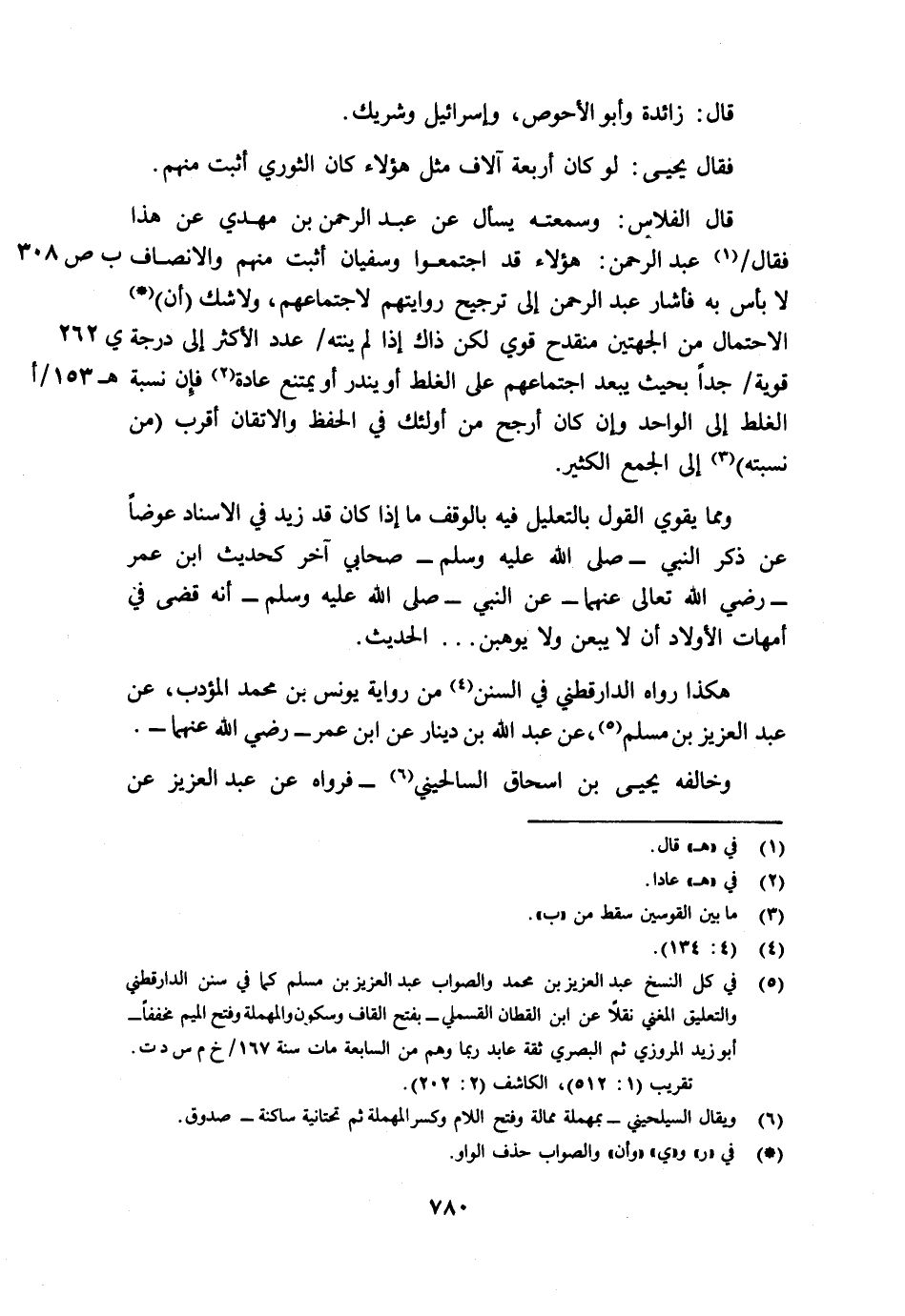 قال الفلاس: "وسمعته يسأل عن عبد الرحمن بن مهدي عن هذا" فقال/ (ب ص 308) 1 عبد الرحمن: "هؤلاء قد اجتمعوا وسفيان أثبت منهم والإنصاف لا بأس به فأشار عبد الرحمن إلى ترجيح روايتهم لاجتماعهم ولا شك (أن) 2 الاحتمال من الجهتين منقدح قوي، لكن ذاك إذا لم ينته/ (ي 262) عدد الأكثر إلى درجة قوية/ (?153/أ) جدا بحيث يبعد اجتماعهم على الغلط أو يندر أو يمتنع عادة 3 فإن نسبة الغلط إلى الواحد وإن كان أرجح من أولئك في الحفظ والإتقان أقرب (من نسبته) 4 إلى جمع الكثير.