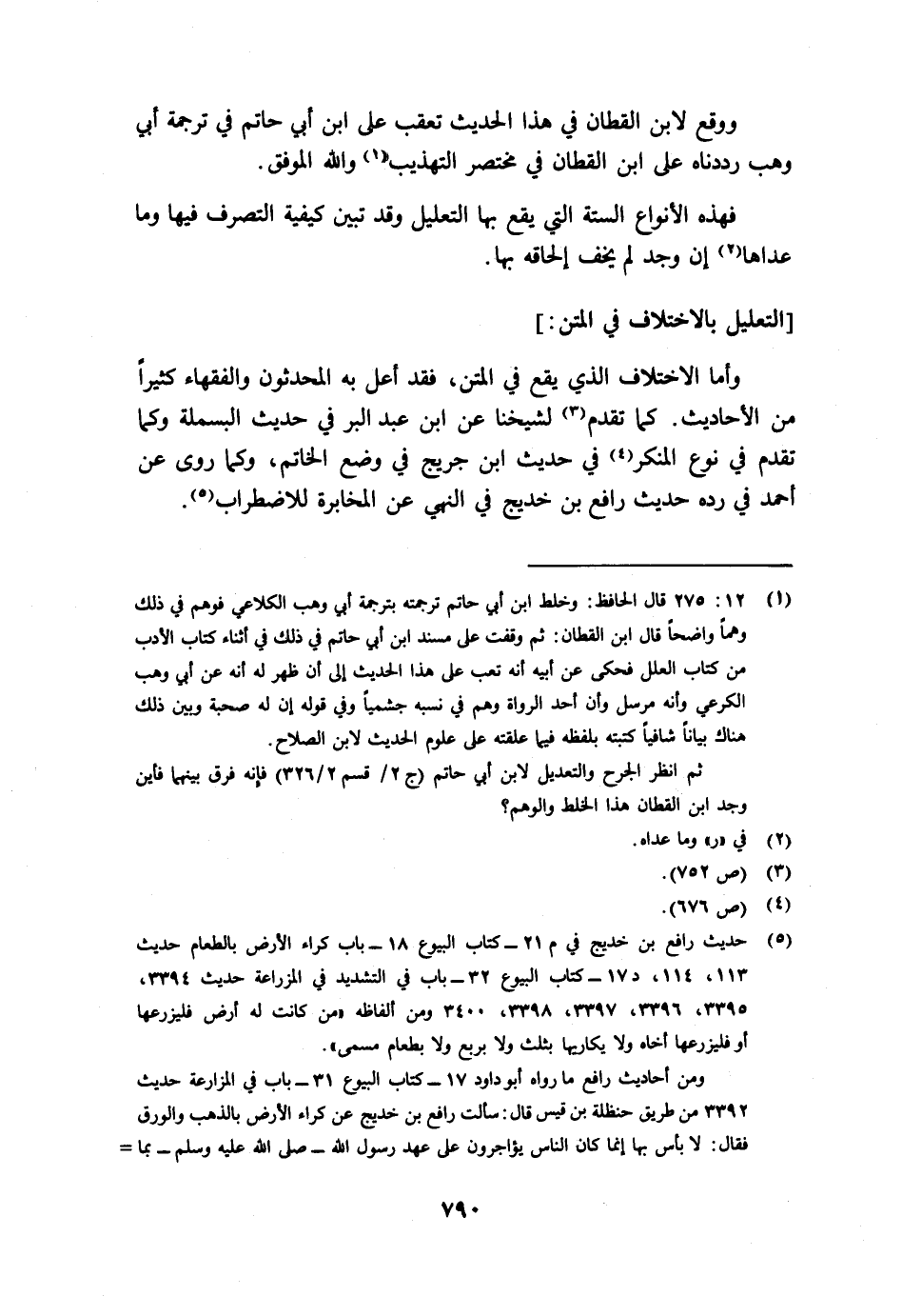 وأما الاختلاف الذي يقع في المتن، فقد أعل به المحدثون والفقهاء كثيرا من الأحاديث. كما تقدم3 لشيخنا ابن عبد البر في حديث البسملة، وكما تقدم في نوع المنكر4 في حديث ابن جريج في وضع الخاتم، وكما روي عن أحمد في رده حديث رافع بن خديج في النهي عن المخابرة للاضطراب5.