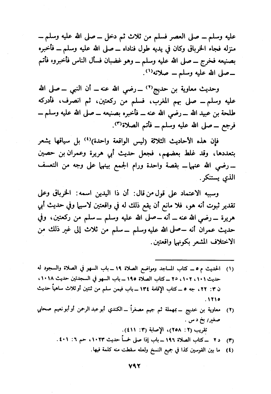 فإن هذه الأحاديث الثلاثة (ليس الواقعة واحدة) 4 بل سياقها يشعر بتعددها، وقد غلط بعضهم، فجعل حديث أبي هريرة وعمران بن حصين رضي الله عنهما بقصة واحدة، ورام الجمع بينهما على وجه من التعسف الذي يستنكر.