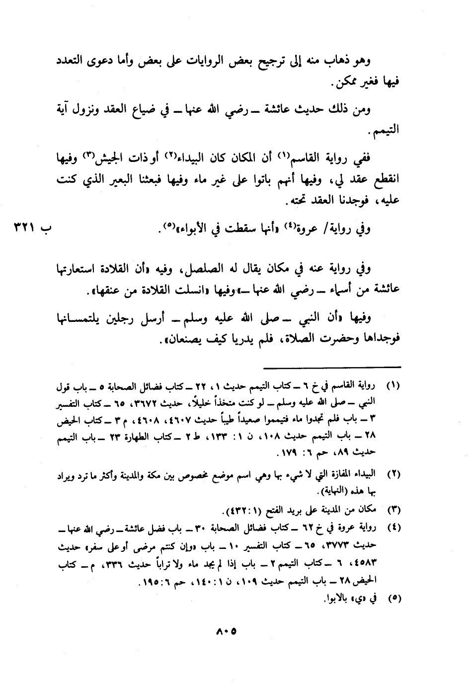 4 رواية عروة في خ 62- كتاب فضائل الصحابة 30- باب فضل عائشة - رضي الله عنها - حديث 3773، 65- كتاب التفسير 10- باب {وَإِنْ كُنْتُمْ مَرْضَى أَوْ عَلَى سَفَرٍ} حديث 4583، 6- كتاب التيمم 2- باب إذا لم يجد ماء ولا ترابا حديث 336، م - كتاب الحيض 28- باب التيمم حديث 109، ن 1/140، حم 6/195.