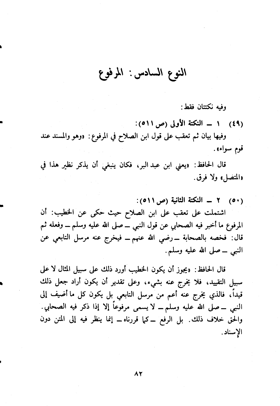 اشتملت على تعقب على ابن الصلاح حيث حكى عن الخطيب: أن المرفوع ما أخبر فيه الصحابي عن قول النبي - صلى الله عليه وسلم - وفعله، ثم قال: فخصه بالصحابة - رضي الله عنهم -، فخرج عنه مرسل التابعي عن النبي - صلى الله عليه وسلم -.