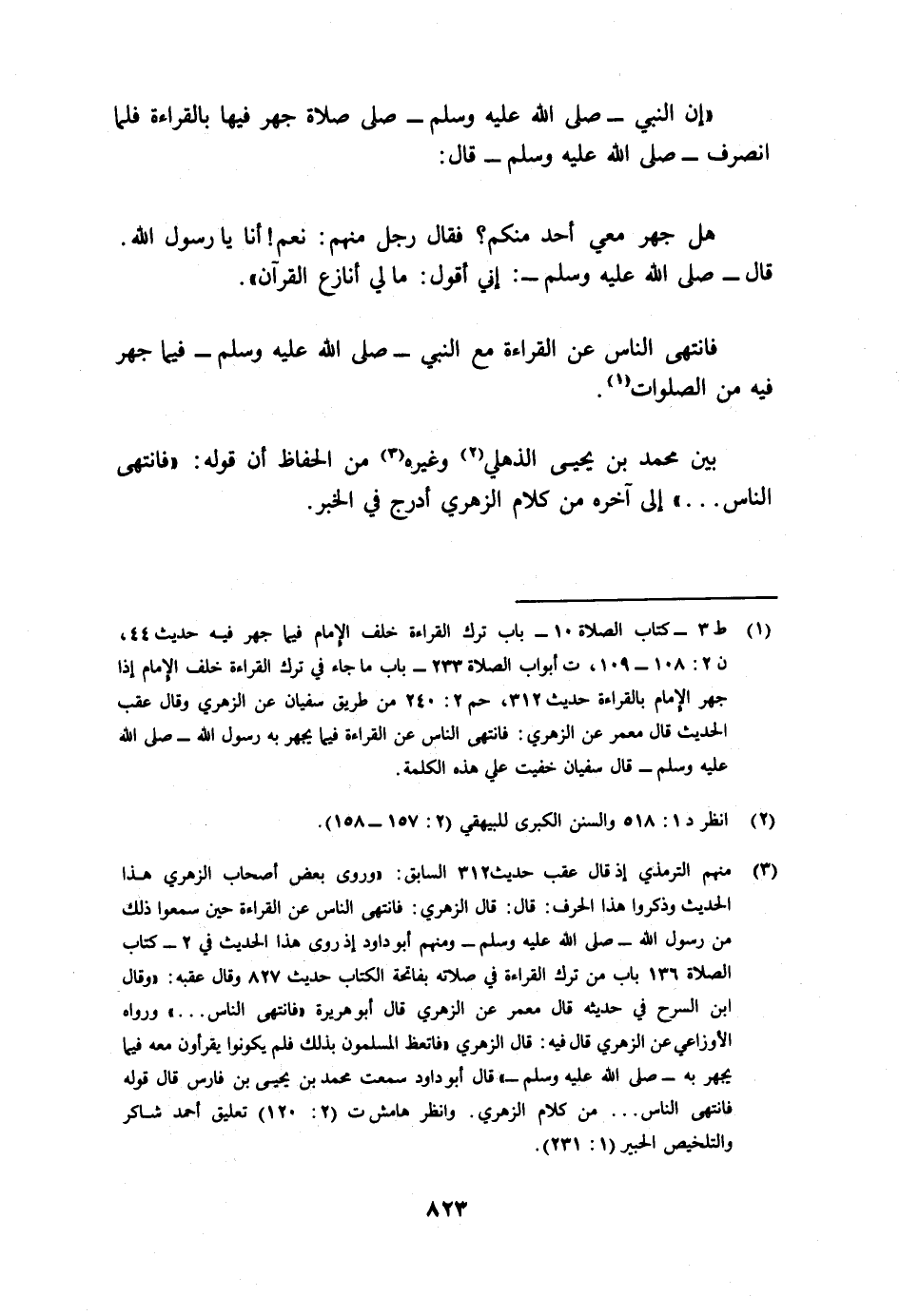 3 منهم الترمذي إذ قال عقب حديث 312 السابق: "وروى بعض أصحاب الزهري هذا الحديث وذكروا هذا الحرف: قال: قال الزهري: فانتهى الناس عن القراءة حين سمعوا ذلك من رسول الله - صلى الله عليه وسلم - ومنهم أبو داود إذ روى هذا الحديث في 2- كتاب الصلاة 136 باب من ترك القراءة في صلاته بفاتحة الكتاب حديث 827 وقال عقبه: "وقال ابن السرح في حديثه قال معمر عن الزهري قال أبو هريرة: "فانتهى الناس ... " ورواه الأوزاعي عن الزهري قال فيه: قال الزهري: "فاتعظ المسلمون بذلك فلم يكونوا يقرأون معه فيما يجهر به - صلى الله عليه وسلم -" قال أبو داود: سمعت محمد بن يحيى بن فارس قال: قوله "فانتهى الناس ... " من كلام الزهري. وانظر هامش ت 2/120 تعليق أحمد شاكر والتلخيص الحبير 1/231.
