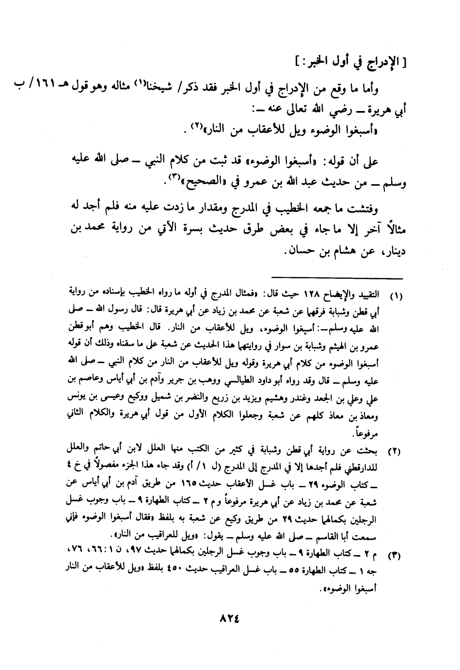 1 التقييد والإيضاح 128 حيث قال: "فمثال المدرج في أوله ما رواه الخطيب بإسناده من رواية أبي قطن وشبابة فرقهما عن شعبة عن محمد بن زياد عن أبي هريرة قال: قال رسول الله - صلى الله عليه وسلم -: "أسبغوا الوضوء، ويل للأعقاب من النار". قال الخطيب: وهم أبو قطن عمرو بن الهيثم وشبابة بن سوار في روايتهما هذا الحديث عن شعبة على ما سقناه وذلك أن قوله: "أسبغوا الوضوء" من كلام أبي هريرة وقوله: "ويل للأعقاب من النار" من كلام النبي - صلى الله عليه وسلم - قال: وقد رواه أبو داود الطيالسي ووهب بن جرير وآدم بن أبي إياس وعاصم بن علي وعلي بن الجعد وغندر وهشيم ويزيد بن زريع والنضر بن شميل ووكيع وعيسى بن يونس ومعاذ بن معاذ كلهم عن شعبة وجعلوا الكلام الأول من قول أبي هريرة والكلام الثاني مرفوعا.
