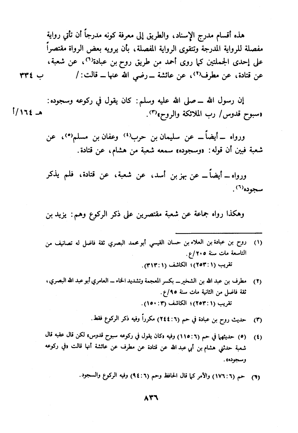 4 حديثهما في حم 6/115 وفيه: "كان يقول في ركوعه سبوح قدوس" لكن قال عقبه قال شعبة حدثني هشام بن أبي عبد الله عن قتادة عن مطرف عن عائشة أنها قالت: "في ركوعه وسجوده".