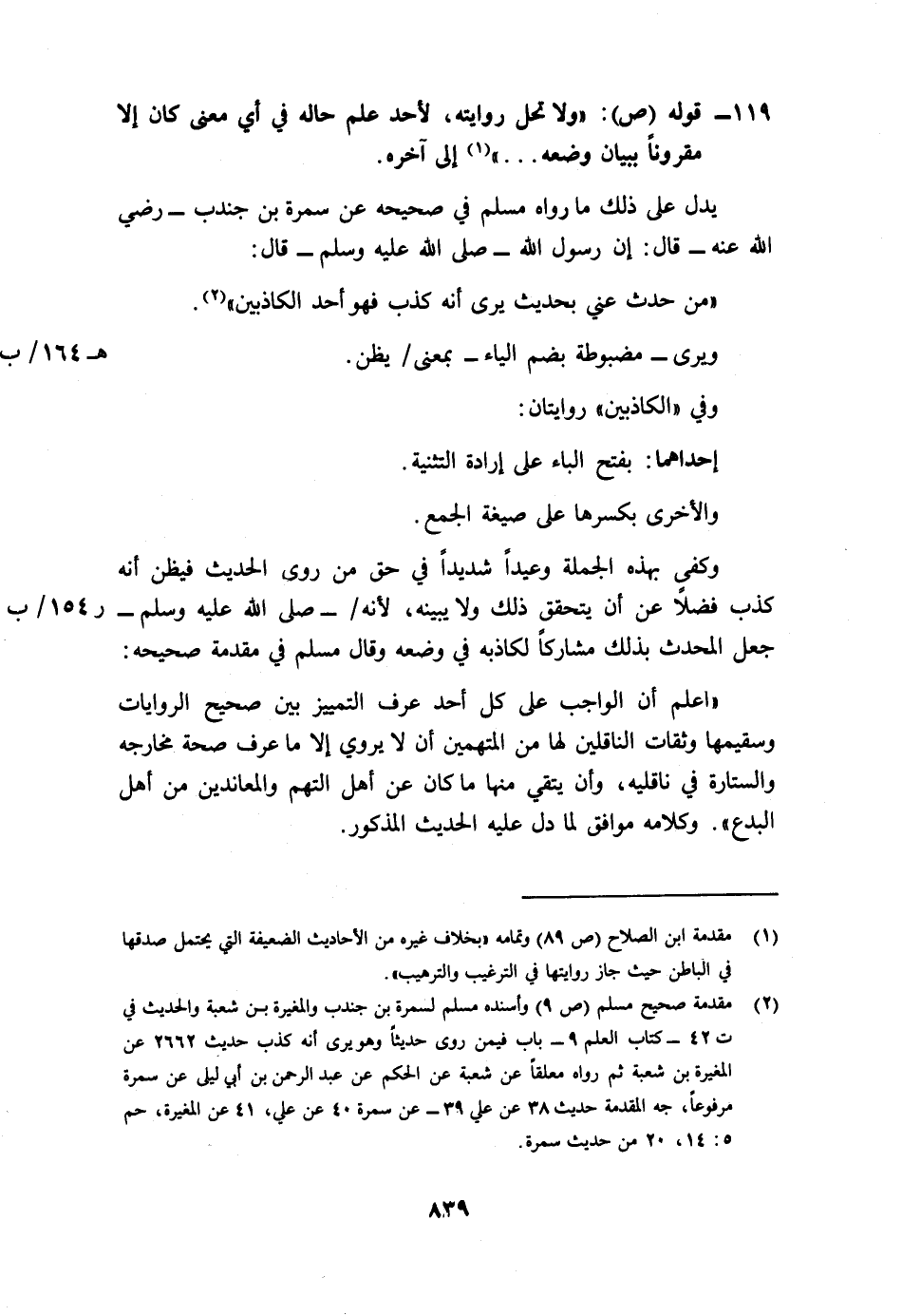 وكفى بهذه الجملة وعيدا شديدا في حق من روى الحديث فيظن أنه كذب فضلا عن أن يتحقق ذلك ولا يبينه، لأنه/ (ر154/ب) - صلى الله عليه وسلم - جعل المحدث بذلك مشاركا لكاذبه في وضعه، وقال مسلم في مقدمة صحيحه: "اعلم أن الواجب على كل أحد عرف التمييز بين صحيح الروايات وسقيمها وثقات الناقلين لها من المتهمين أن لا يروي إلا ما عرف صحة مخارجه والستارة في ناقليه، وأن يتقي منها ما كان عن أهل التهم والمعاندين من أهل البدع". وكلامه موافق لما دل عليه الحديث المذكور.