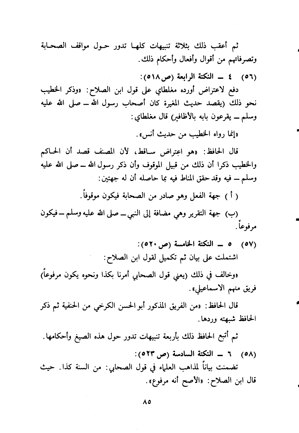 اشتملت على بيان ثم تكميل لقول ابن الصلاح: "وخالف في ذلك (يعني قول الصحابي أمرنا بكذا ونحوه يكون مرفوعا) فريق منهم الإسماعيلي".