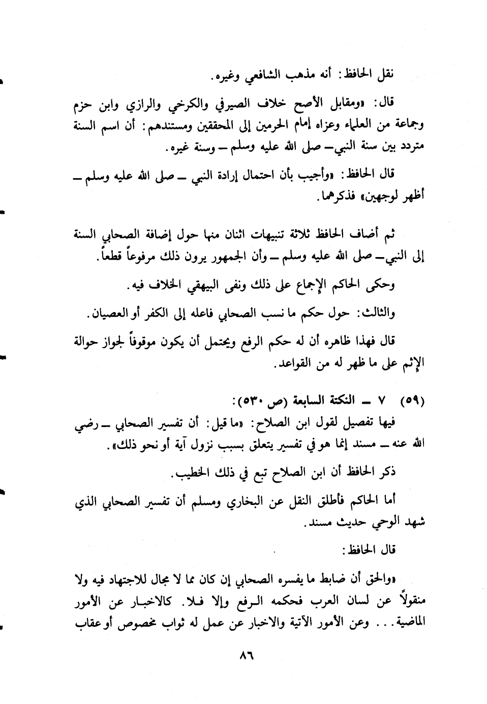 ثم أضاف الحافظ ثلاثة تنبيهات اثنان منها حول إضافة الصحابي السنة إلى النبي - صلى الله عليه وسلم -، وأن الجمهور يرون ذلك مرفوعا قطعا.