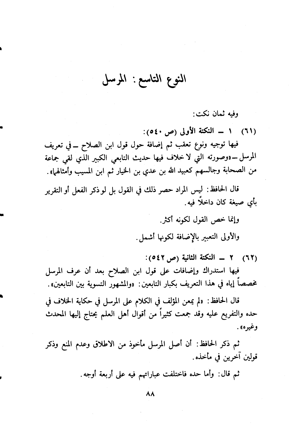 فيها استدراك وإضافات على قول ابن الصلاح بعد أن عرف المرسل مخصصا إياه في هذا التعريف بكبار التابعين: "والمشهور التسوية بين التابعين)