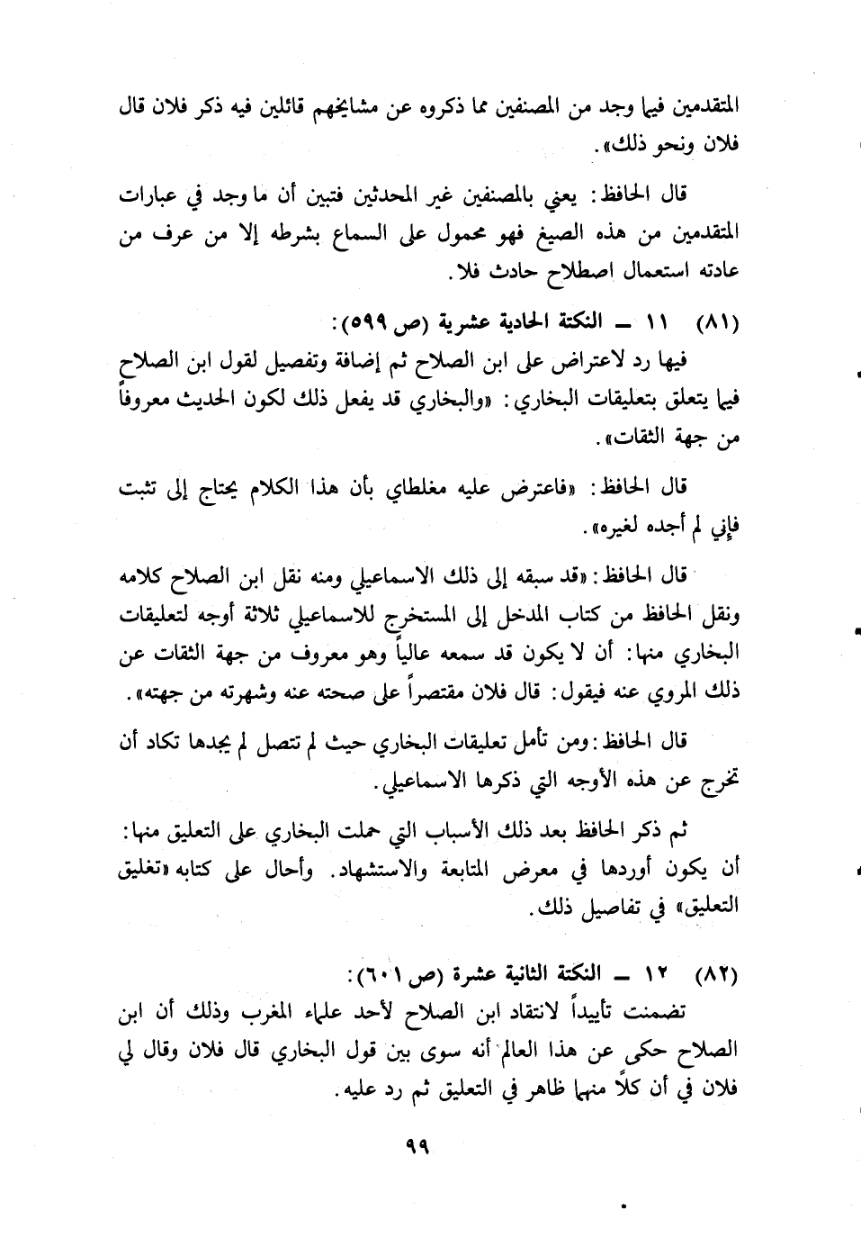 فيها رد لاعتراض على ابن الصلاح ثم إضافة وتفصيل لقول ابن الصلاح فيما يتعلق بتعليقات البخاري: "والبخاري قد يفعل ذلك لكون الحديث معروفا من جهة الثقات".