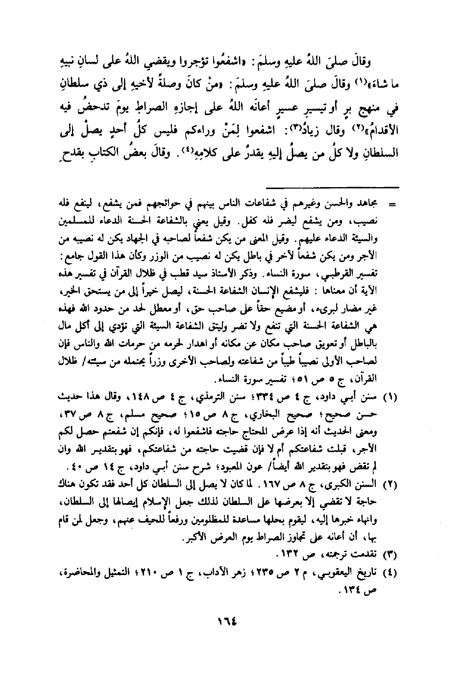 وَقَالَ صلى الله عَلَيْهِ وَسلم اشفعوا تؤجروا وَيَقْضِي الله على لِسَان نبيه مَا شَاءَ وَقَالَ صلى الله عَلَيْهِ وَسلم من كَانَ وصلَة لِأَخِيهِ إِلَى ذِي سُلْطَان فِي مَنْهَج بر أَو تيسير عسير أَعَانَهُ الله على إجَازَة الصِّرَاط يَوْم تدحض فِيهِ الْأَقْدَام وَقَالَ زِيَاد اشفعوا لمن وراءكم فَلَيْسَ كل أحد يصل إِلَى السُّلْطَان وَلَا كل من يصل إِلَيْهِ يقدر على كَلَامه وَقَالَ بعض الْكتاب بقدح