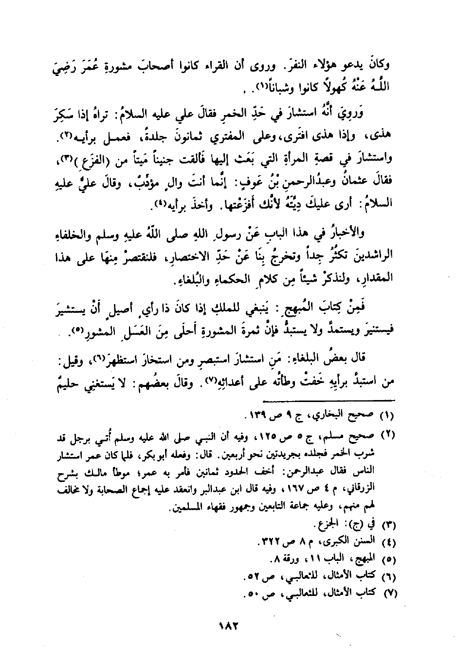 وَرُوِيَ أَنه اسْتَشَارَ فِي حد الْخمر فَقَالَ عَلَيْهِ الصَّلَاة وَالسَّلَام ترَاهُ إِذا سكر هذى وَإِذا هذى افترى وعَلى المفتري ثَمَانُون جلدَة فَعمل بِرَأْيهِ وَاسْتَشَارَ فِي قصَّة الْمَرْأَة الَّتِي بعث إِلَيْهَا فَأَلْقَت جَنِينا مَيتا من الْفَزع فَقَالَ عُثْمَان وَعبد الرَّحْمَن بن عَوْف إِنَّمَا أَنْت وَال مؤدب وَقَالَ عَليّ عَلَيْهِ السَّلَام أرى عَلَيْك دِيَته لِأَنَّك أفزعتها وَأخذ بِرَأْيهِ