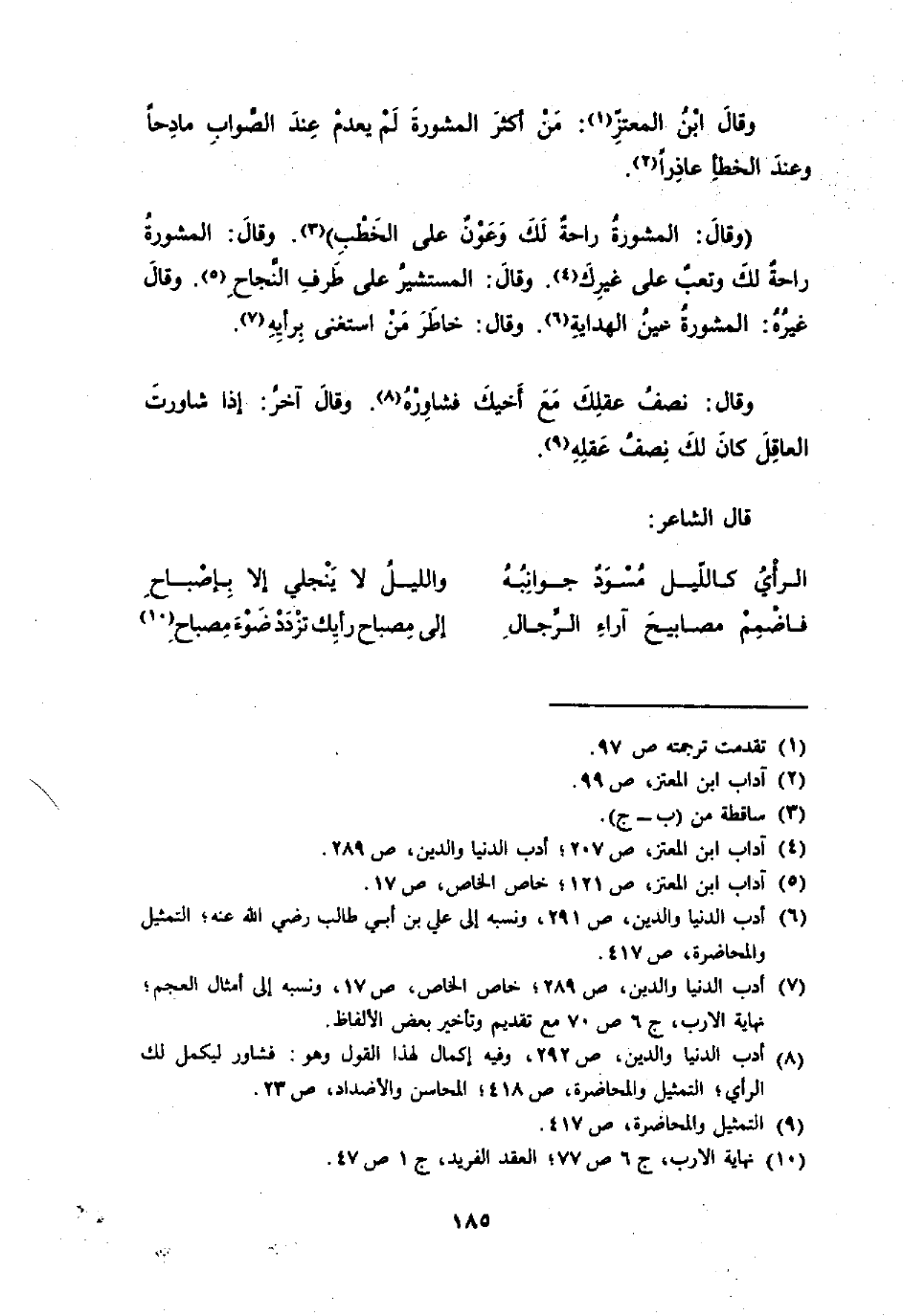 (فاضمم مصابيح آراء الرِّجَال ... إِلَى مِصْبَاح رَأْيك تَزْدَدْ ضوء مِصْبَاح)