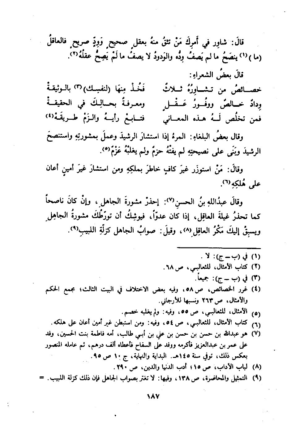 وَقَالَ بعض البلغاء الْمَرْء إِذا اسْتَشَارَ الرشيد وَعمل بمشورته واستنصح الرشيد وَبنى على نصيحته لم يفته حزم وَلم يغلبه عزم