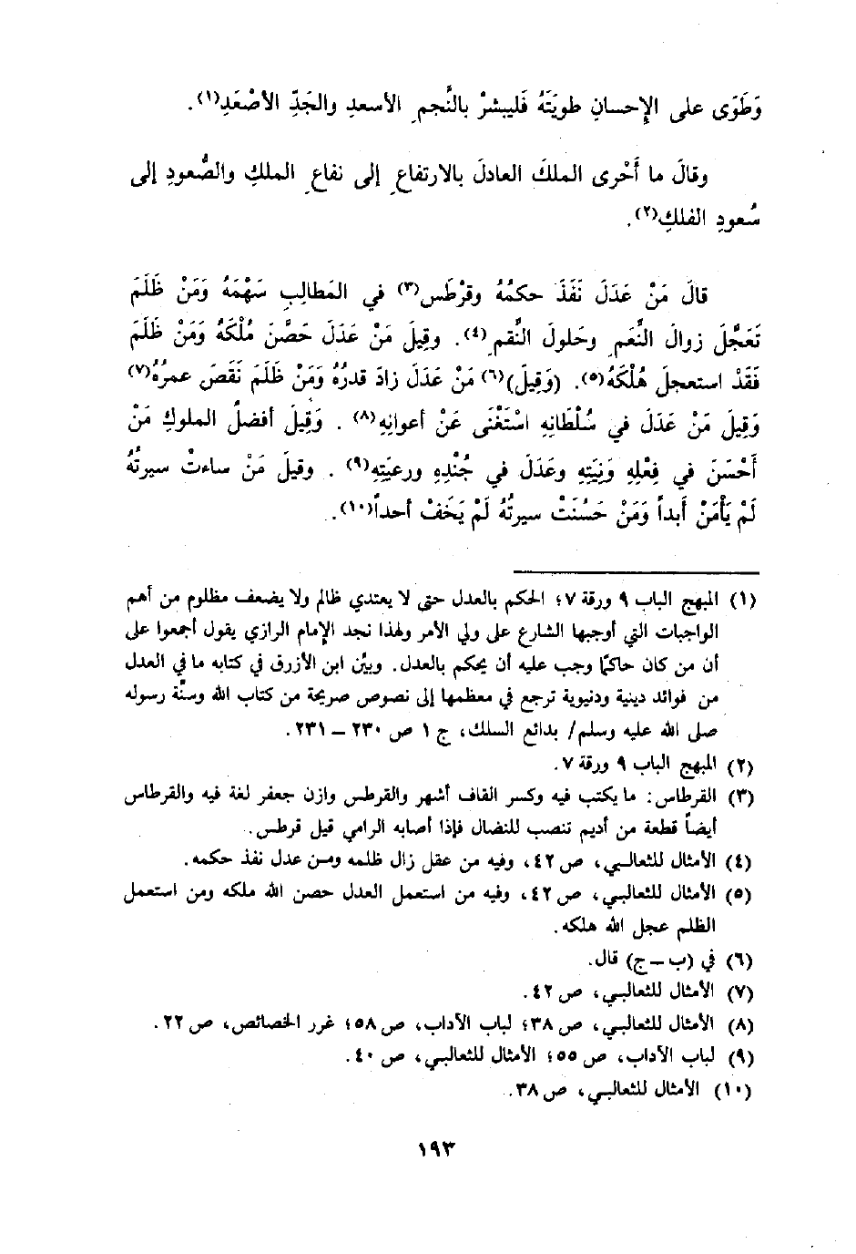 قَالَ من عدل نفذ حكمه وقرطس فِي المطالب سَهْمه وَمن ظلم تعجل زَوَال النعم وحلول النقم وَقيل من عدل حصن ملكه وَمن ظلم فقد استعجل هلكه وَقيل من عدل زَاد قدره وَمن ظلم نقص عمره وَقيل من عدل فِي سُلْطَانه اسْتغنى عَن أعوانه وَقيل أفضل الْمُلُوك من أحسن فِي فعله وَنِيَّته وَعدل فِي جنده ورعيته وَقيل من ساءت سيرته لم يَأْمَن أبدا وَمن حسنت سيرته لم يخف أحدا