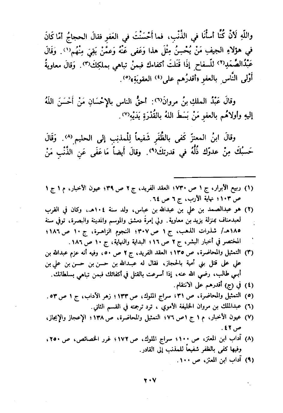 وَالله لِأَن أسأنا فِي الذَّنب فَمَا أَحْسَنت فِي الْعَفو فَقَالَ الْحجَّاج أما كَانَ فِي هَؤُلَاءِ الْجِيَف من يحسن مثل هَذَا وَعفى عَنهُ وَعَمن بَقِي مِنْهُم وَقَالَ عبد الصَّمد للسفاح إِذا قتلت أكفاءك فبمن تباهي بملكك وَقَالَ مُعَاوِيَة أولى النَّاس بِالْعَفو أقدرهم على الْعقُوبَة