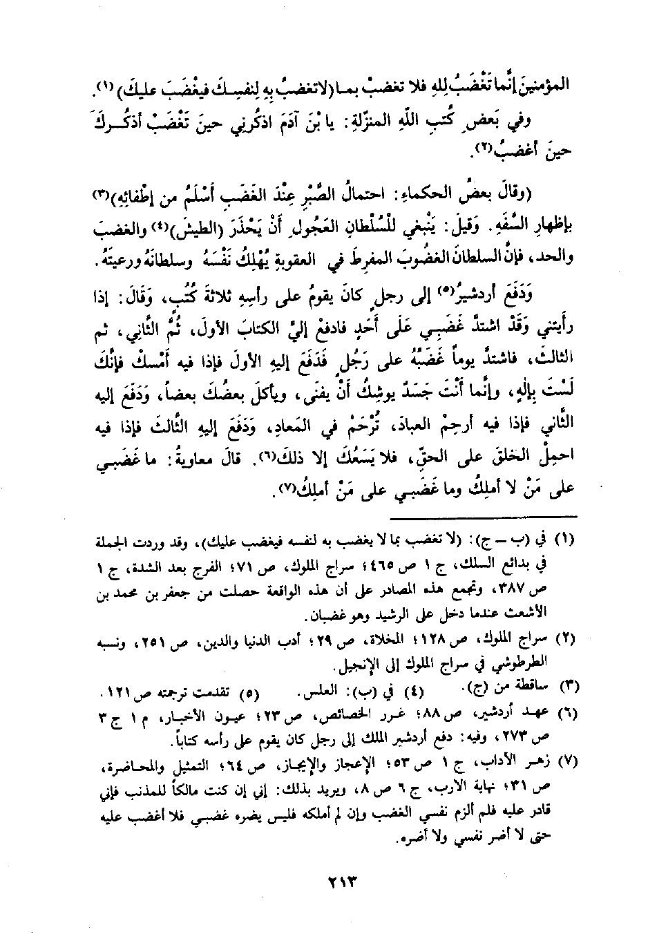 وَدفع أردشير إِلَى رجل كَانَ يقوم على رَأسه ثَلَاثَة كتب وَقَالَ إِذا رَأَيْتنِي وَقد اشْتَدَّ غَضَبي على أحد فادفع إِلَيّ الْكتاب الأول ثمَّ الثَّانِي ثمَّ الثَّالِث فَاشْتَدَّ يَوْمًا غَضَبه على رجل فَدفع إِلَيْهِ الأول فَإِذا فِيهِ أمسك فَإنَّك لست بإله وَإِنَّمَا أَنْت جَسَد يُوشك أَن يفنى وَيَأْكُل بعضك بَعْضًا وَدفع إِلَيْهِ الثَّانِي فَإِذا فِيهِ أرْحم الْعباد ترحم فِي الْمعَاد وَدفع إِلَيْهِ الثَّالِث فَإِذا فِيهِ أحمل اخلق على الْحق فَلَا يسعك إِلَّا ذَلِك قَالَ مُعَاوِيَة مَا غَضَبي على من لَا أملك وَمَا غَضَبي على من أملك
