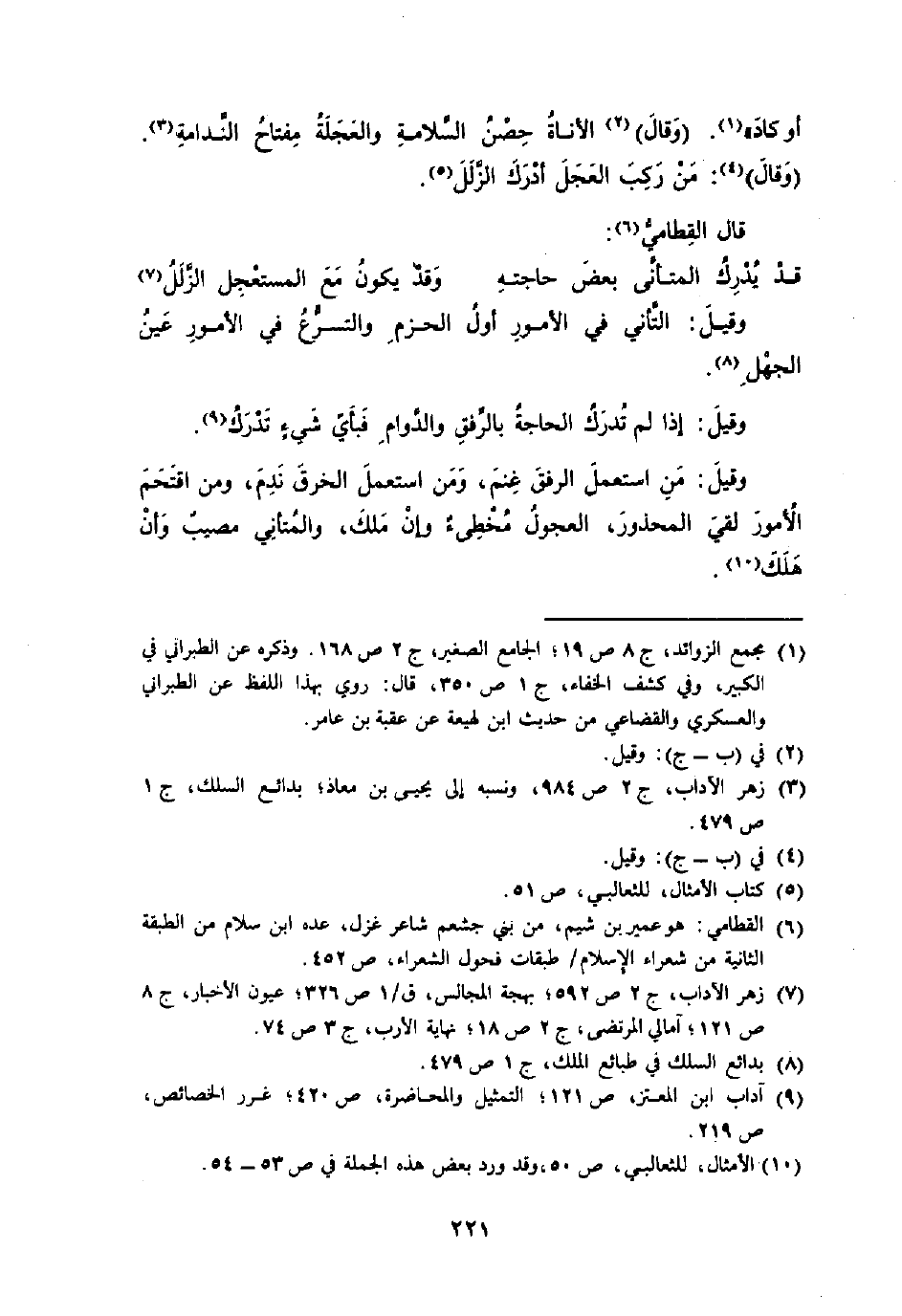 أَو كَاد وَقَالَ الأناة حصن السَّلامَة والعجلة مِفْتَاح الندامة وَقَالَ من ركب الْعجل أدْرك الزلل