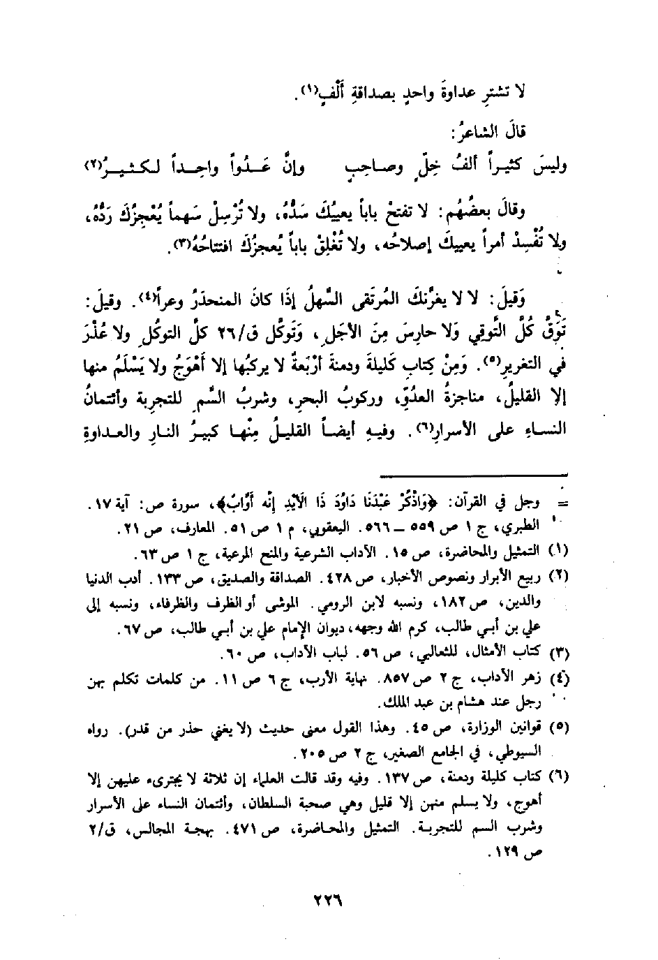 وَقيل لَا لَا يغرنك المرتقى السهل إِذا كَانَ المنحدر وعرا وَقيل توق كل التوقي وَلَا حارس من الْأَجَل وتوكل ق 26 كل التَّوَكُّل وَلَا عذر فِي التَّغْرِير وَمن كتاب كليلة ودمنة أَرْبَعَة لَا يركبهَا إِلَّا أَعْوَج وَلَا يسلم مِنْهَا إِلَّا الْقَلِيل مناجزة الْعَدو وركوب الْبَحْر وَشرب السم للتجربة وائتمان النِّسَاء على الْأَسْرَار وَفِيه أَيْضا الْقَلِيل مِنْهَا كَبِير النَّار والعداوة