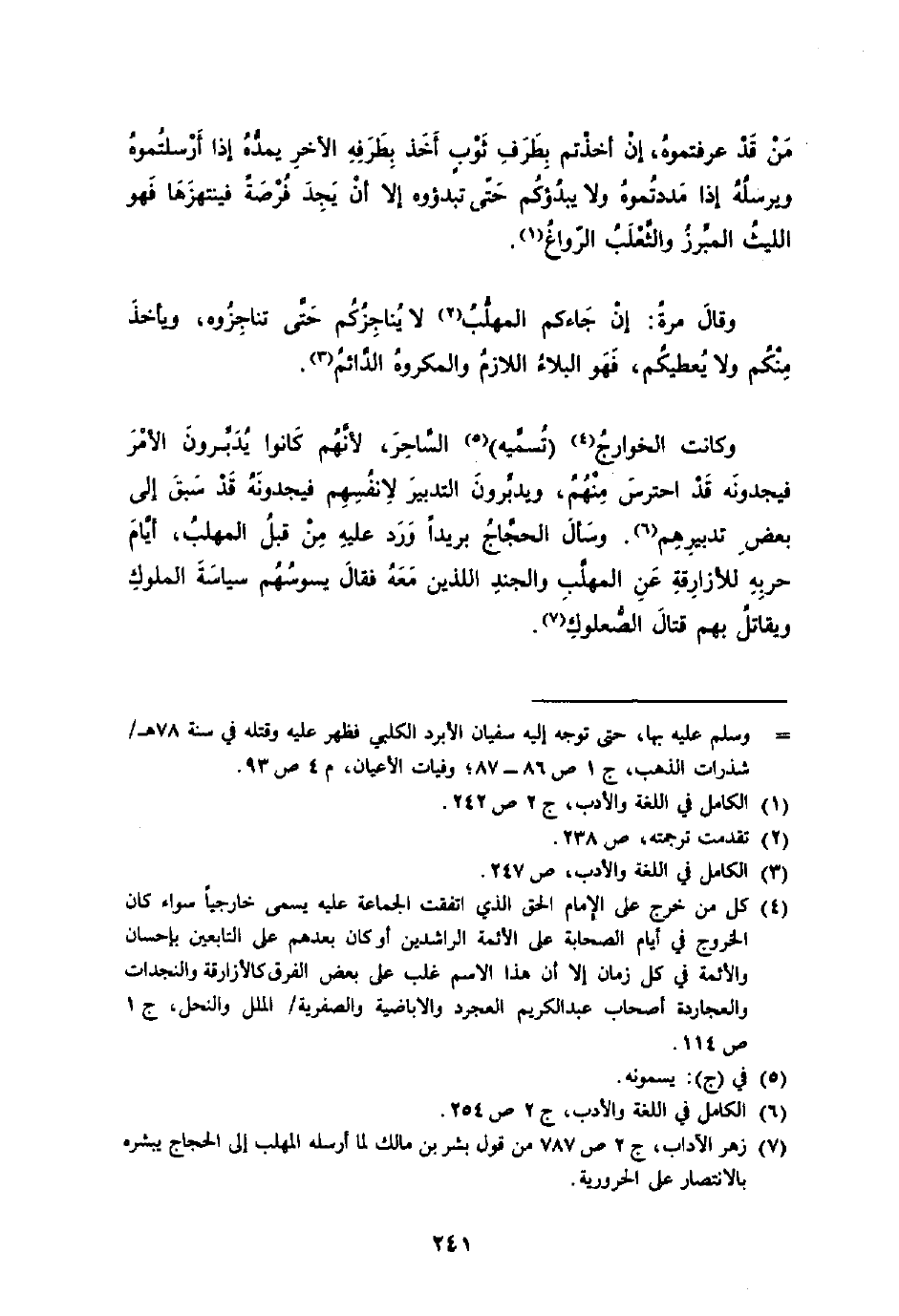 وَكَانَت الْخَوَارِج تسميه السَّاحر لأَنهم كَانُوا يدبرون الْأَمر فيجدونه قد احترس مِنْهُم ويدبرون التَّدْبِير لأَنْفُسِهِمْ فيجدونه قد سبق إِلَى بعض تدبيرهم وَسَأَلَ الْحجَّاج بريدا ورد عَلَيْهِ من قبل الْمُهلب أَيَّام حربه للأزارقة عَن الْمُهلب والجند اللَّذين مَعَه فَقَالَ يسوسهم سياسة الْمُلُوك وَيُقَاتل بهم قتال الصعلوك