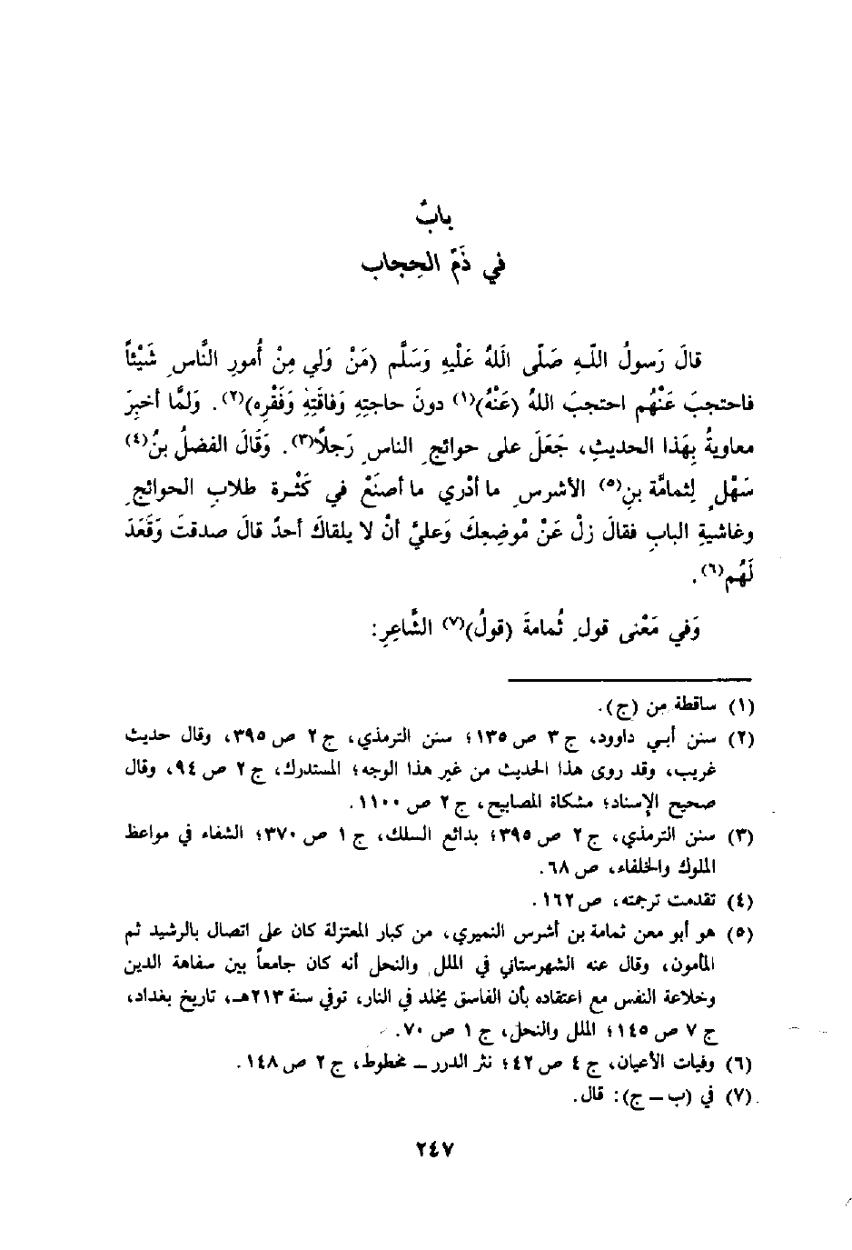 قَالَ رَسُول الله صلى الله عَلَيْهِ وَسلم من ولي من أُمُور النَّاس شَيْئا فاحتجبت عَنْهُم احتجب الله عَنهُ دون حَاجته وفاقته وَفَقره وَلما أخبر مُعَاوِيَة بِهَذَا الحَدِيث جعل على حوائج النَّاس رجلا وَقَالَ الْفضل بن سهل لثمامة بن الأشرس مَا أَدْرِي مَا اصْنَع فِي كَثْرَة طلاب الْحَوَائِج وغاشية الْبَاب فَقَالَ زل عَن موضعك وَعلي أَن لَا يلقاك أحد قَالَ صدقت وَقعد لَهُم