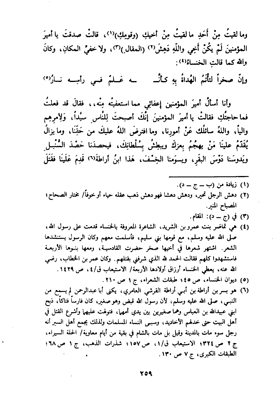 وَمَا لقِيت من أحد مَا لقِيت من أَخِيك وقومك قَالَت صدقت يَا أَمِير الْمُؤمنِينَ لم يكن أخي وَالله دهش الْمقَال وَلَا خَفِي الْمَكَان وَكَانَ وَالله كَمَا قَالَت الخنساء