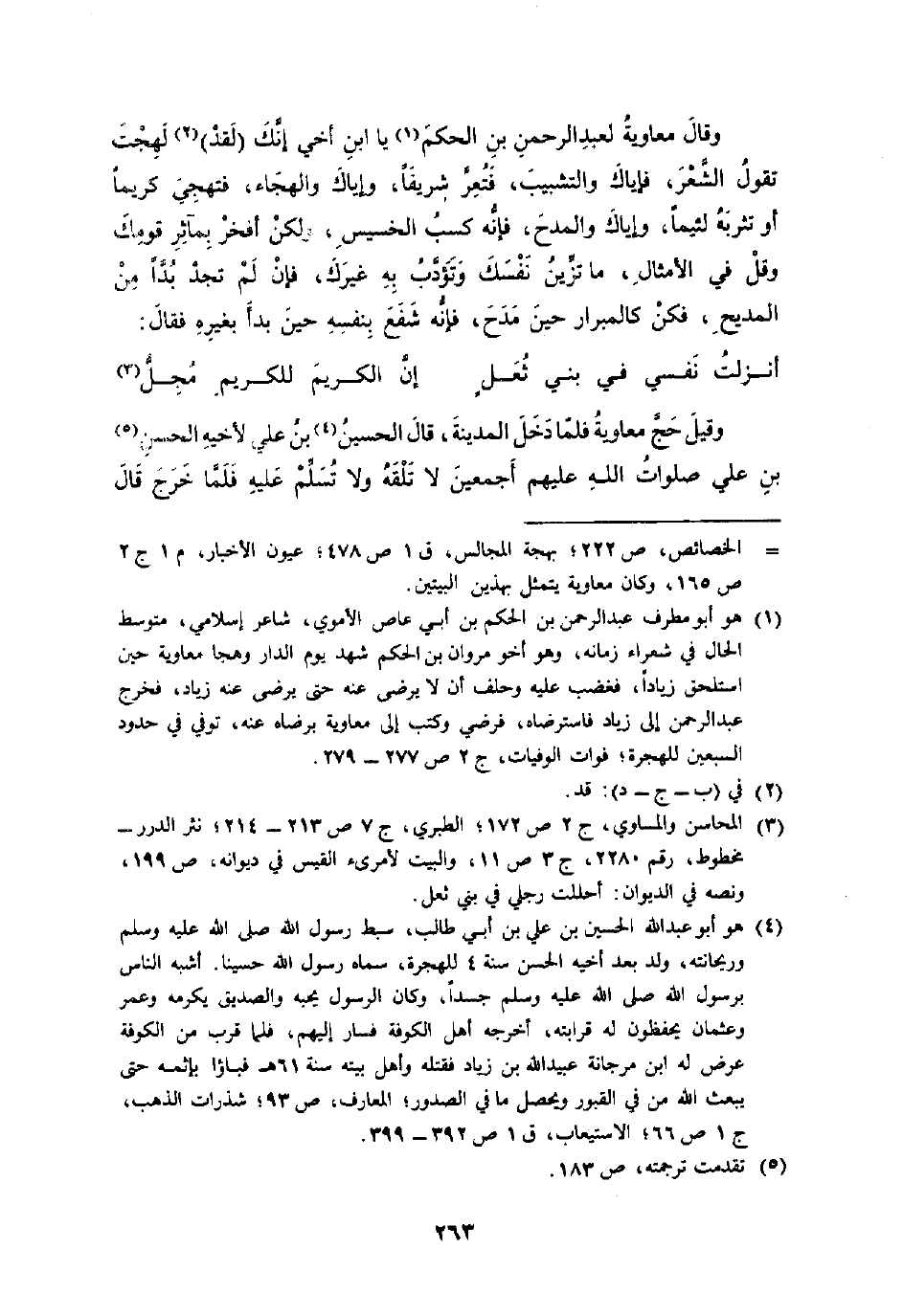 وَقَالَ مُعَاوِيَة لعبد الرَّحْمَن بن الحكم يَا ابْن أخي إِنَّك لقد لهجت تَقول الشّعْر فإياك والتشبيب فتعر شريفا وَإِيَّاك والهجاء فتهجي كَرِيمًا أَو تثربه لئيما وَإِيَّاك والمدح فَإِنَّهُ كسب الخسيس وَلَكِن أَفْخَر بمآثر قَوْمك وَقل فِي الْأَمْثَال مَا تزين نَفسك وتؤدب بِهِ غَيْرك فَإِن لم تَجِد بَدَأَ من المديح فَكُن كالمبرار حِين مدح فَإِنَّهُ شفع بِنَفسِهِ حِين بَدَأَ بِغَيْرِهِ فَقَالَ