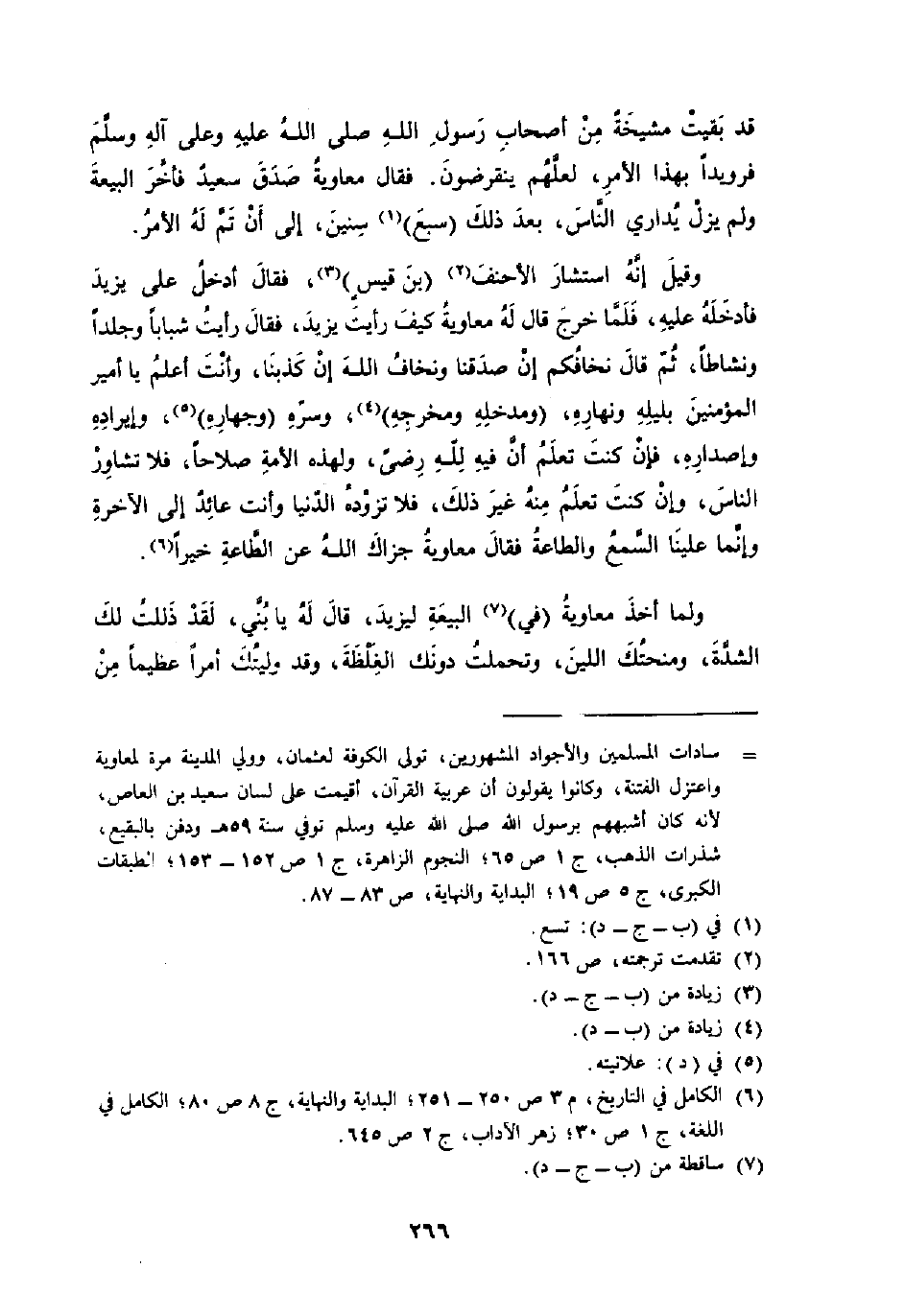 قد بقيت مشيخة من أَصْحَاب رَسُول الله صلى الله عَلَيْهِ وَسلم عَلَيْهِ وعَلى آله وَسلم فرويدا بِهَذَا الْأَمر لَعَلَّهُم ينقرضون فَقَالَ مُعَاوِيَة صدق سعيد فَأخر الْبيعَة وَلم يزل يُدَارِي النَّاس بعد ذَلِك سبع سِنِين إِلَى أَن تمّ لَهُ الْأَمر