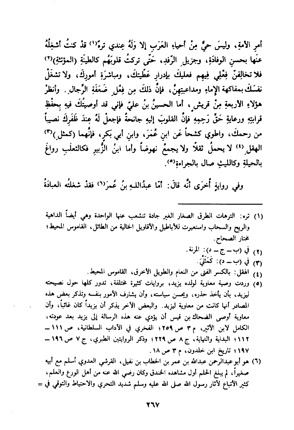 أَمر هَذِه الْأمة وَلَيْسَ حَيّ من أَحيَاء الْعَرَب إِلَّا وَله عِنْدِي تره قد كنت أشغله عَنْهَا بِحسن الْوِفَادَة وجزيل الرفد حَتَّى تركت قُلُوبهم كالطينة المؤتثة فَلَا تخالفن فعلي فيهم فَعَلَيْك بإدرار عطيتك ومباشرة أمورك وَلَا تشغل نَفسك بمفاكهة الْإِمَاء ومداعبتهن فَإِن ذَلِك من فعل ضعفة الرِّجَال وَانْظُر هَؤُلَاءِ الْأَرْبَعَة من قُرَيْش أما الْحُسَيْن بن عَليّ فَإِنِّي قد أوصيك فِيهِ بِحِفْظ قرَابَته ورعاية حق رَحمَه فَإِن الْقُلُوب إِلَيْهِ جانحة فَاجْعَلْ لَهُ عِنْد ظفرك نَصِيبا من رَحِمك واطوي كشحا عَن ابْن عمر وَابْن أبي بكر فَإِنَّهُمَا كَمثل الهقل لَا يحمل ثقلا وَلَا يجمع نهوضا وَأما ابْن الزبير فكالثعلب رواغ بالحيلة وكالليث صال بالجراءة