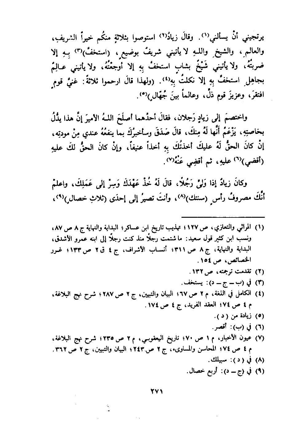 يرتجيني أَن يسألني وَقَالَ زِيَاد اسْتَوْصُوا بِثَلَاثَة مِنْكُم خيرا الشريف والعالم وَالشَّيْخ وَالله لَا يأتيني شرِيف بوضيع أستخف بِهِ إِلَّا ضَربته وَلَا يأتيني شيخ بشاب استخف بِهِ إِلَّا أوجعته وَلَا يأتيني عَالم بجاهل استخف بِهِ إِلَّا نكلت بِهِ وَلِهَذَا قَالَ ارحموا ثَلَاثَة غَنِي قوم افْتقر وعزيز قوم ذل وعالما بَين جهال