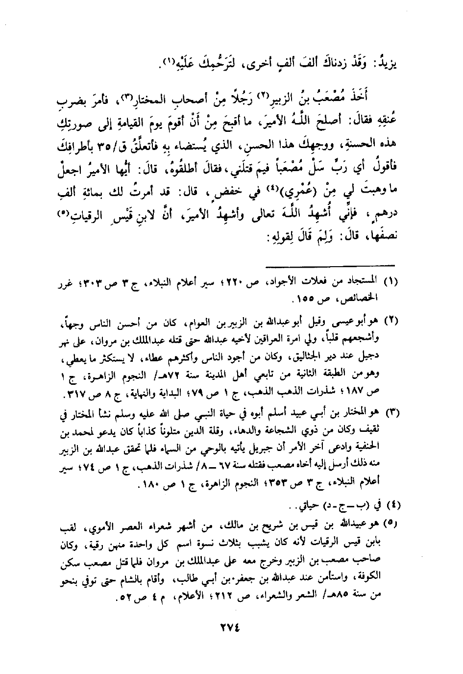 أَخذ مُصعب بن الزبير رجلا من أَصْحَاب الْمُخْتَار فَأمر بِضَرْب عُنُقه فَقَالَ أصلح الله الْأَمِير مَا أقبح من أَن أقوم يَوْم الْقِيَامَة إِلَى صُورَتك هَذِه الْحَسَنَة ووجهك هَذَا الْحسن الَّذِي يستضاء بِهِ فأتعلق ق 35 بأطرافك فَأَقُول أَي رب سل مصعبا فيمَ قتلني فَقَالَ أَطْلقُوهُ قَالَ أَيهَا الْأَمِير أجعَل مَا وهبت لي من عمري فِي خفض قَالَ قد أمرت لَك بِمِائَة ألف دِرْهَم فَإِنِّي أشهد الله تَعَالَى وَأشْهد الْأَمِير أَن لِابْنِ قيس الرقيات نصفهَا قَالَ وَلما قَالَ لقَوْله