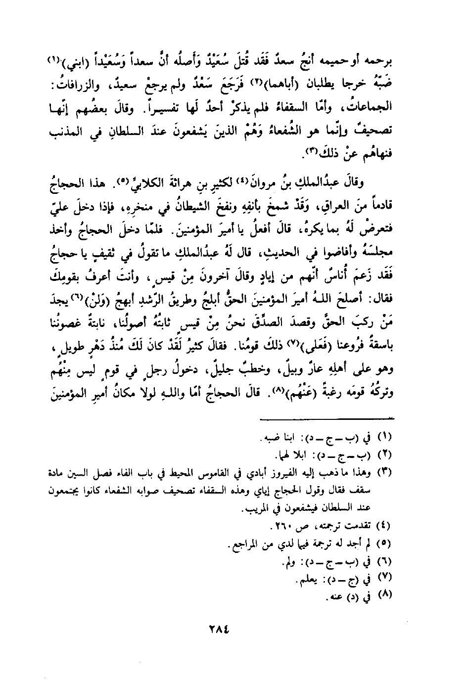 وَقَالَ عبد الْملك بن مَرْوَان لكثير بن هراثة الْكلابِي هَذَا الْحجَّاج قادما من الْعرَاق وَقد شمخ بِأَنْفِهِ وَنفخ الشَّيْطَان فِي منخره فَإِذا دخل عَليّ فتعرض لَهُ بِمَا يكره قَالَ أفعل يَا أَمِير الْمُؤمنِينَ فَلَمَّا دخل الْحجَّاج وَأخذ مَجْلِسه وأفاضوا فِي الحَدِيث قَالَ لَهُ عبد الْملك مَا تَقول فِي ثَقِيف يَا حجاج فقد زعم أنَاس أَنهم من إياد وَقَالَ آخَرُونَ من قيس وَأَنت أعرف بقومك فَقَالَ أصلح الله أَمِير الْمُؤمنِينَ الْحق أَبْلَج وَطَرِيق الرشد أبهج وَلنْ يجد من ركب الْحق وَقصد الصدْق نَحن من قيس ثبته أصولنا نابتة أصولنا نابتة غصوننا باسقة فروعنا فعلى ذَلِك قَومنَا فَقَالَ كثير لقد كَانَ لَك مُنْذُ دهر طَوِيل وَهُوَ على أَهله عَار وبيل وخطب جليل وَدخُول رجل فِي قوم لَيْسَ مِنْهُم وَتَركه قومه رَغْبَة عَنْهُم قَالَ الْحجَّاج أما وَالله لَوْلَا مَكَان أَمِير الْمُؤمنِينَ