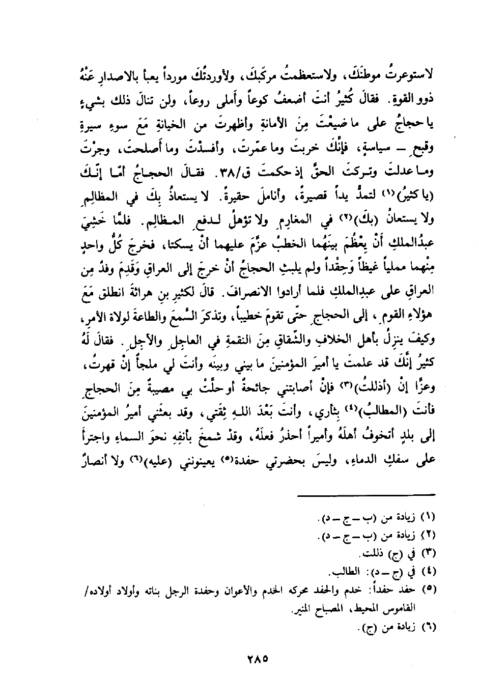 لاستوعرت موطنك ولاستعظمت مركبك ولأوردتك موردا يعبأ بالإصدار عَنهُ ذَوُو الْقُوَّة فَقَالَ كثير أَنْت أَضْعَف كوعا وأملى روعا وَلنْ تنَال بذلك شَيْئا يَا حجاج على مَا ضيعت من الْأَمَانَة وأظهرت من الْخِيَانَة مَعَ سوء سيرة وقبح سياسة فَإنَّك خربَتْ وَمَا عمرت وأفسدت وَمَا أصلحت وَجَرت وَمَا عدلت وَتركت الْحق إِذْ حكمت ق 38 فَقَالَ الْحجَّاج أما أَنَّك يَا كثير لتمد يدا قَصِيرَة وأنامل حقيرة لَا يستعاذ بك فِي الْمَظَالِم وَلَا يستعان بك فِي المغارم وَلَا تؤهل لدفع الْمَظَالِم فَلَمَّا خشِي عبد الْملك أَن يعظم بَينهمَا الْخطب عزم عَلَيْهِمَا أَن يسكتا فَخرج كل وَاحِد مِنْهُمَا ممليا غيظا وحقدا وَلم يلبث الْحجَّاج أَن خرج إِلَى الْعرَاق وَقدم وَفد من الْعرَاق على عبد الْملك فَلَمَّا أَرَادوا الِانْصِرَاف قَالَ لكثير بن هراثة انْطلق مَعَ هَؤُلَاءِ الْقَوْم إِلَى الْحجَّاج حَتَّى تقوم خَطِيبًا وتذكر السّمع وَالطَّاعَة لولاة الْأَمر وَكَيف ينزل بِأَهْل الْخلاف والشقاق من النقمَة فِي العاجل ولآجل فَقَالَ لَهُ كثير إِنَّك قد علمت يَا أَمِير الْمُؤمنِينَ مَا بيني وَبَينه وَأَنت لي ملْجأ إِن قهرت وَعزا إِن أذللت فَإِن أصابتني جَائِحَة أَو حلت بِي مُصِيبَة من الْحجَّاج فَأَنت المطالب بِثَأْرِي وَأَنت بعد الله ثقتي وَقد بعث أَمِير الْمُؤمنِينَ إِلَى بلد أَتَخَوَّف أَهله وأميرا أحذر فعله وَقد شمخ بِأَنْفِهِ نَحْو السَّمَاء واجترأ على سفك الدِّمَاء وَلَيْسَ بحضرتي حفدة يعينوني عَلَيْهِ وَلَا أنصار