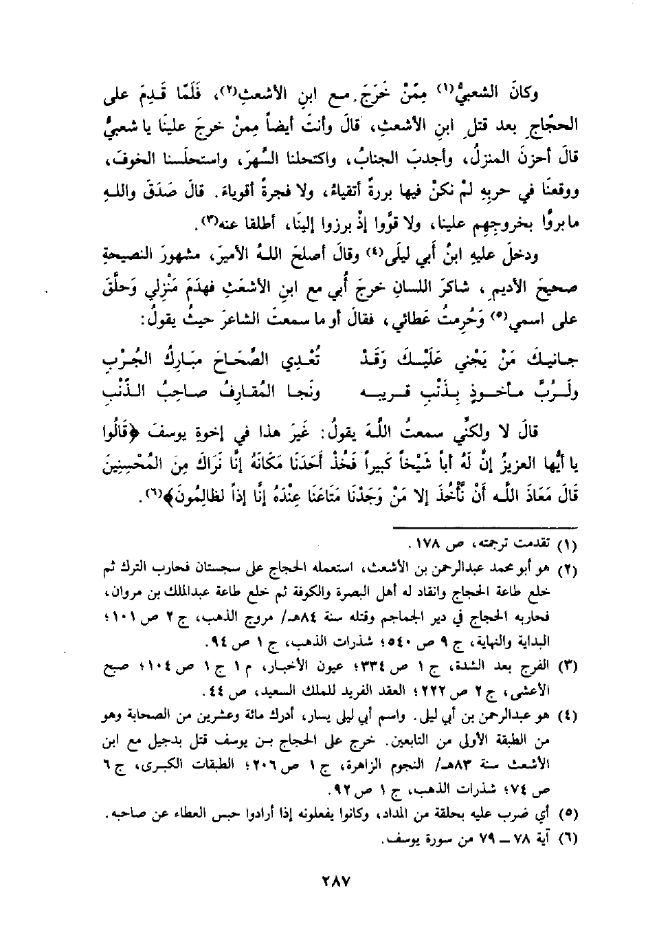 وَكَانَ الشّعبِيّ مِمَّن خرج مَعَ ابْن الْأَشْعَث فَلَمَّا قدم على الْحجَّاج بعد قتل ابْن الْأَشْعَث قَالَ وَأَنت أَيْضا مِمَّن خرج علينا يَا شعبي قَالَ أَحْزَن الْمنزل وأجدب الجناب واكتحلنا السهر واستحلسنا الْخَوْف ووقعنا فِي حربه لم نَكُنْ فِيهَا بررة أتقياء وَلَا فجرة أقوياء قَالَ صدق وَالله مَا بروا بخروجهم علينا وَلَا قووا إِذْ برزوا إِلَيْنَا أطلقا عَنهُ
