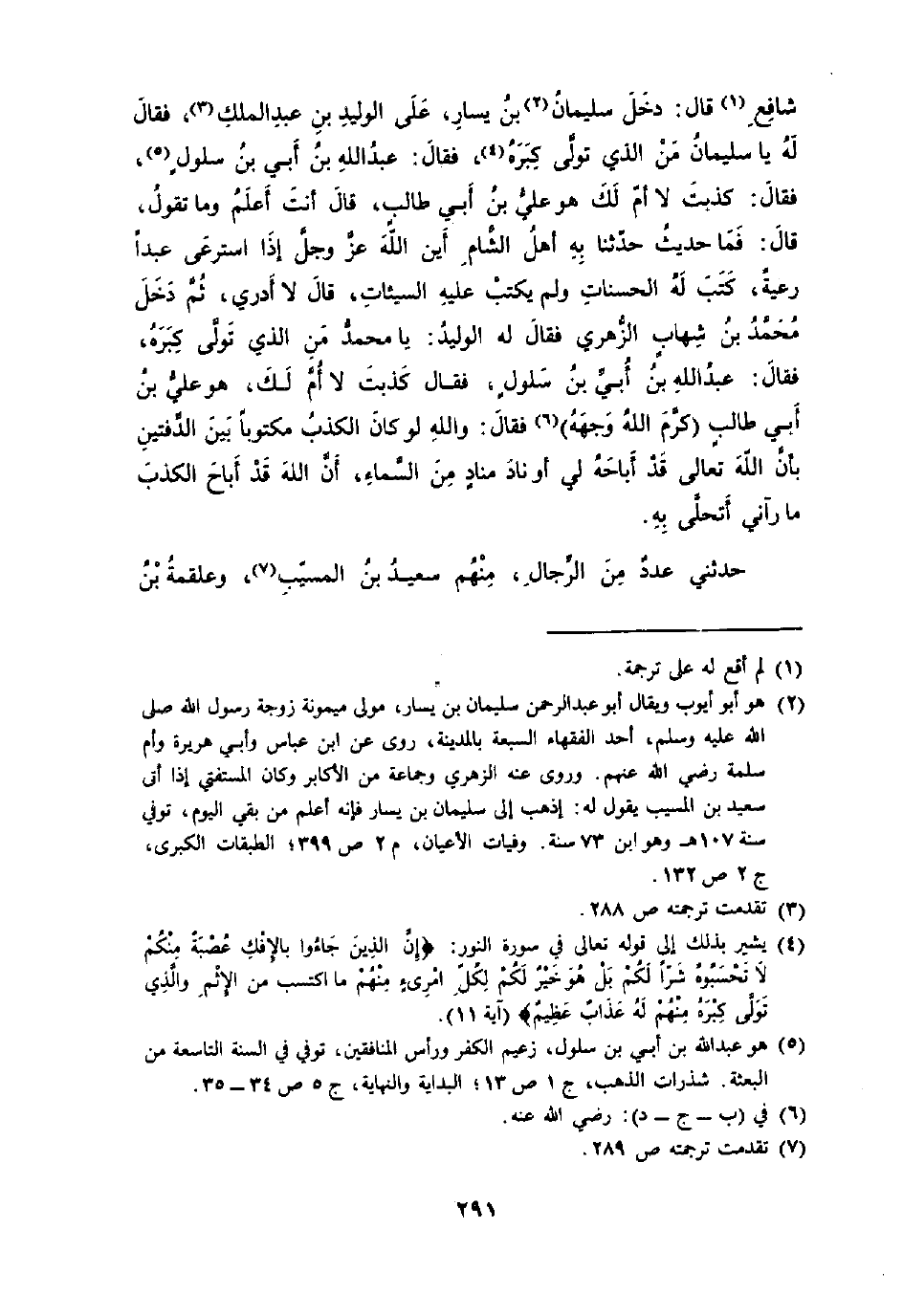 شَافِع قَالَ دخل سُلَيْمَان بن يسَار على الْوَلِيد بن عبد الْملك فَقَالَ لَهُ يَا سُلَيْمَان من الَّذِي تولى كبره فَقَالَ عبد الله بن أبي بن سلول فَقَالَ كذبت لَا أم لَك هُوَ عَليّ بن أبي طَالب قَالَ أَبَت أعلم وَمَا تَقول قَالَ فَمَا حَدِيث حَدثنَا بِهِ أهل الشَّام أَيْن الله عز وَجل إِذا أسترعى عبدا رعيه كتب لَهُ الْحَسَنَات وَلم يكْتب عَلَيْهِ السَّيِّئَات قَالَ لَا أَدْرِي ثمَّ دخل مُحَمَّد بن شهَاب الزُّهْرِيّ قَالَ لَهُ الْوَلِيد يَا مُحَمَّد من الَّذِي تولى كبره فَقَالَ عبد الله بن أبي بن سلول فَقَالَ كذبت لَا أم لَك هُوَ عَليّ بن أبي طَالب كرم الله وَجهه فَقَالَ وَالله لَو كَانَ الْكَذِب مَكْتُوبًا بَين الدفتين بِأَن الله تَعَالَى أَبَاحَهُ لي أَو نَاد مُنَاد من السَّمَاء أَن الله قد أَبَاحَ الْكَذِب مَا رَآنِي اتحلى بِهِ
